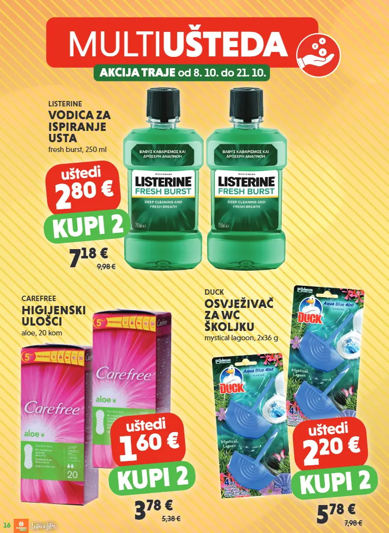 16 duck osvježivač za wc školjku mystical lagoon, 2x36 g listerine vodica za ispiranje usta fresh burst, 250 ml multi ušteda akcija traje od 8. 10. do 21. 10. € € € 9,98 € 7 18 € uštedi 2 80 € kupi 2 carefree higijenski ulošci aloe, 20 kom 5,38 € 3 78 € uštedi 1 60 € kupi 2 7,98 € 5 78 € uštedi 2 20 € kupi 2