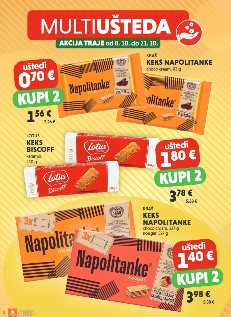 2 multi ušteda akcija traje od 8. 10. do 21. 10. € € € 2,26 € 1 56 € uštedi 0 70 € kupi 2 kraš keks napolitanke choco cream, 93 g 5,38 € 3 98 € uštedi 1 40 € kupi 2 kraš keks napolitanke choco cream, 327 g nougat, 327 g lotus keks biscoff karamel, 250 g 5,58 € 3 78 € uštedi 1 80 € kupi 2