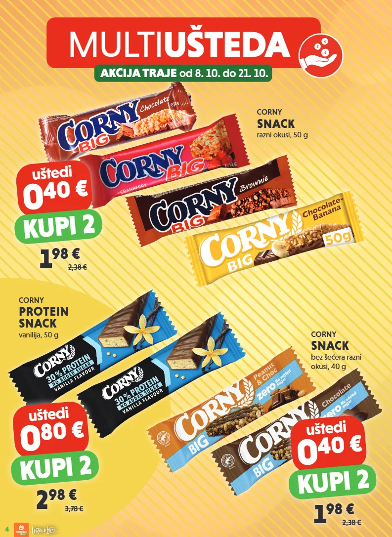4 CORNY SNACK razni okusi, 50 g 2,38 € 1 98 € uštedi 0 40 € KUPI 2 3,78 € 2 98 € uštedi 0 80 € KUPI 2 CORNY PROTEIN SNACK vanilija, 50 g CORNY SNACK bez šećera razni okusi, 40 g 2,38 € 1 98 € uštedi 0 40 € KUPI 2 MULTI UŠTEDA AKCIJA TRAJE od 8. 10. do 21. 10. € € €