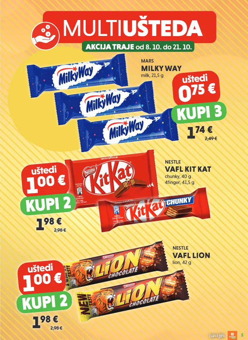 5 MARS MILKY WAY milk, 21,5 g 2,49 € 1 74 € uštedi 0 75 € KUPI 3 NESTLE VAFL KIT KAT chunky, 40 g 4finger, 41,5 g 2,98 € 1 98 € uštedi 1 00 € KUPI 2 NESTLE VAFL LION lion, 42 g 2,98 € 1 98 € uštedi 1 00 € KUPI 2 MULTI UŠTEDA AKCIJA TRAJE od 8. 10. do 21. 10. € € €