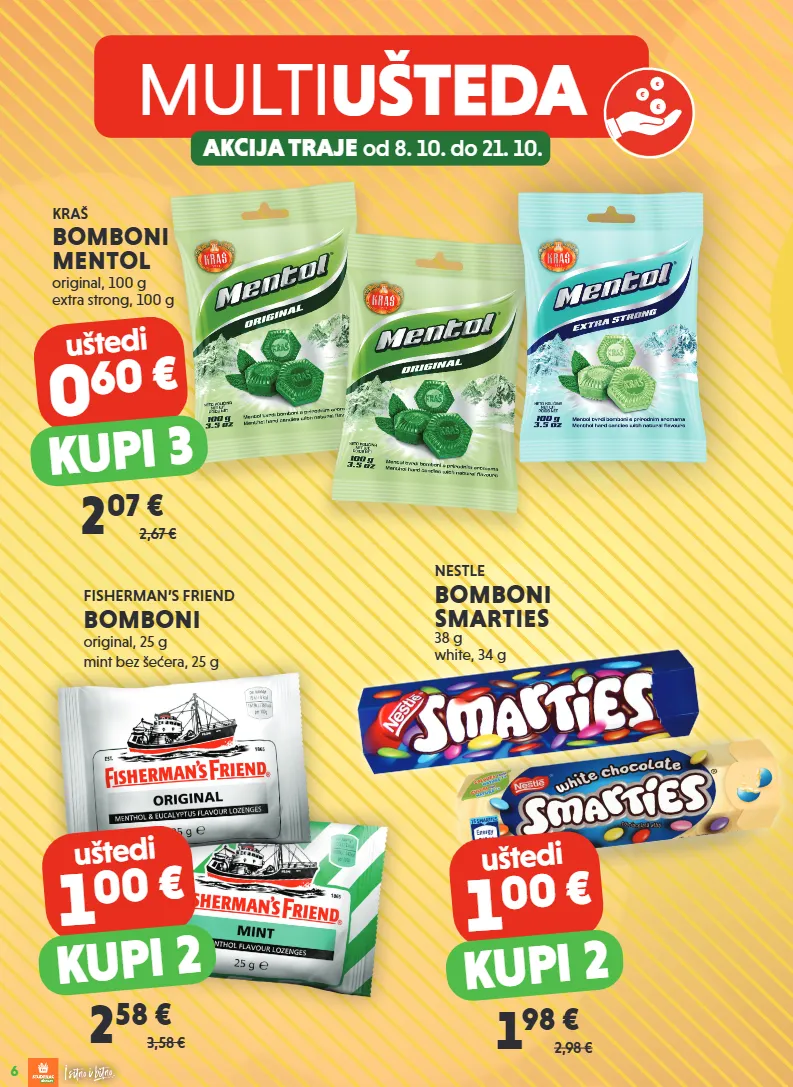 6 kraš bomboni mentol original, 100 g extra strong, 100 g 2,67 € 2 07 € uštedi 0 60 € kupi 3 fisherman’s friend bomboni original, 25 g mint bez šećera, 25 g 3,58 € 2 58 € uštedi 1 00 € kupi 2 nestle bomboni smarties 38 g white, 34 g 2,98 € 1 98 € uštedi 1 00 € kupi 2 multi ušteda akcija traje od 8. 10. do 21. 10. € € €