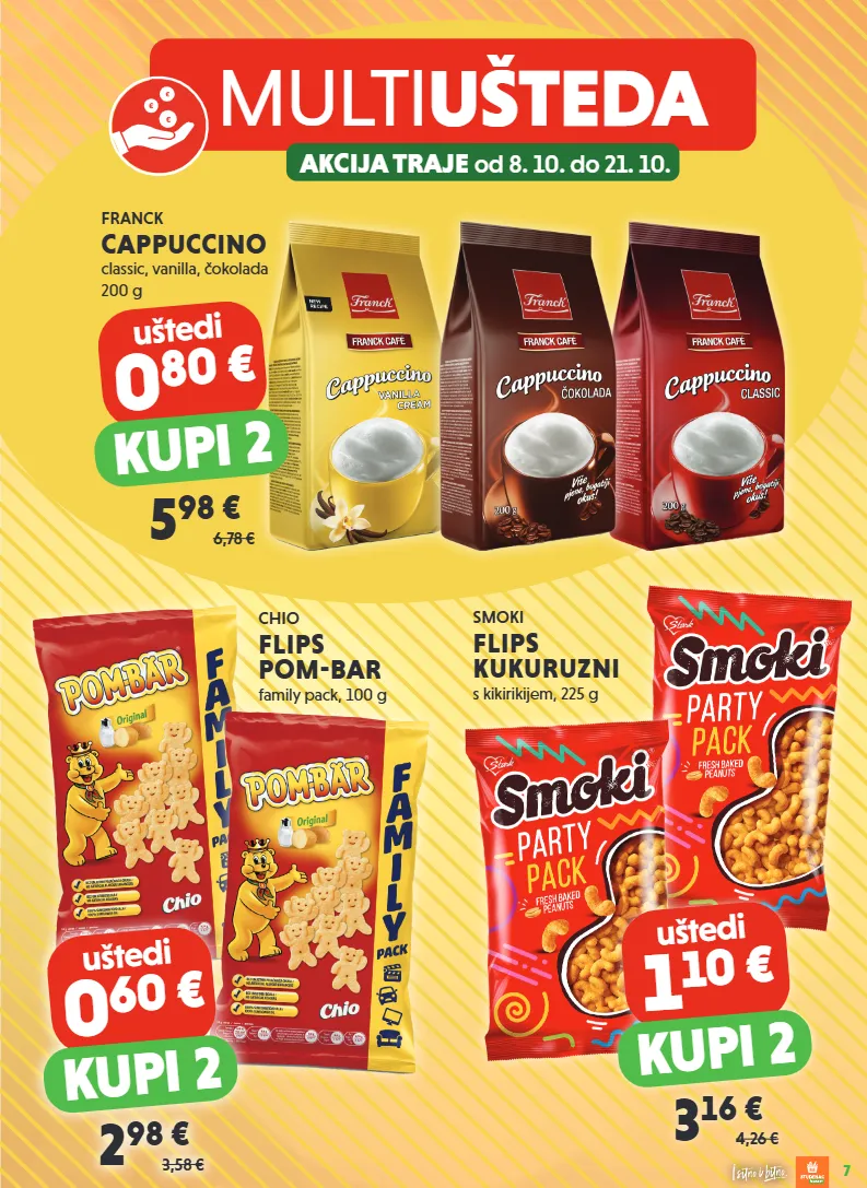 7 franck cappuccino classic, vanilla, čokolada 200 g 6,78 € 5 98 € uštedi 0 80 € kupi 2 chio flips pom-bar family pack, 100 g smoki flips kukuruzni s kikirikijem, 225 g 3,58 € 2 98 € uštedi 0 60 € kupi 2 4,26 € 3 16 € uštedi 1 10 € kupi 2 multi ušteda akcija traje od 8. 10. do 21. 10. € € €