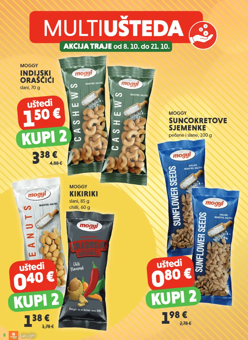 8 moggy indijski oraščići slani, 70 g 4,88 € 3 38 € uštedi 1 50 € kupi 2 moggy suncokretove sjemenke pečene i slane, 100 g 1,78 € 1 38 € uštedi 0 40 € kupi 2 moggy kikiriki slani, 85 g chilli, 60 g 2,78 € 1 98 € uštedi 0 80 € kupi 2 multi ušteda akcija traje od 8. 10. do 21. 10. € € €
