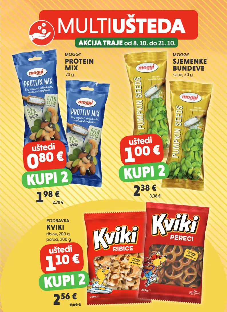 9 MOGGY PROTEIN MIX 70 g 2,78 € 1 98 € uštedi 0 80 € KUPI 2 MOGGY SJEMENKE BUNDEVE slane, 50 g 3,38 € 2 38 € uštedi 1 00 € KUPI 2 3,66 € 2 56 € uštedi 1 10 € KUPI 2 PODRAVKA KVIKI ribice, 200 g pereci, 200 g MULTI UŠTEDA AKCIJA TRAJE od 8. 10. do 21. 10. € € €