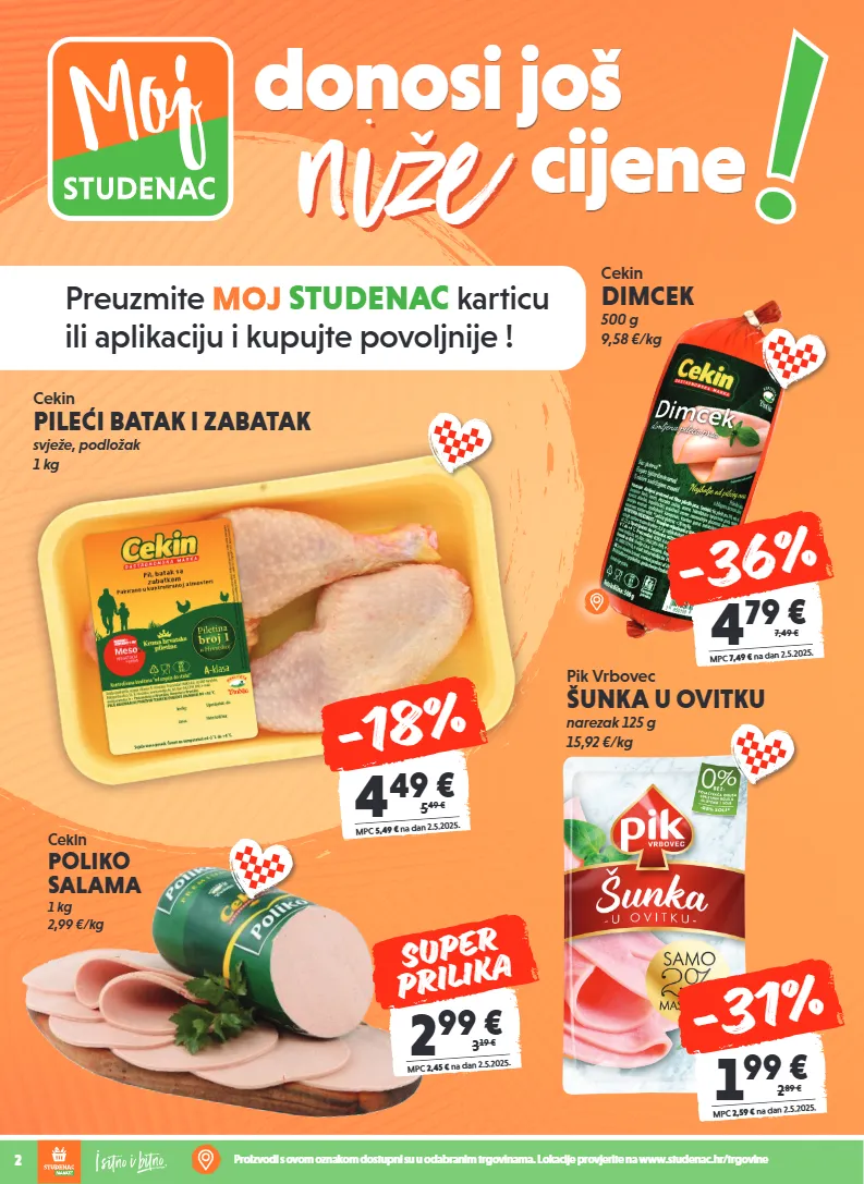 donosi još cijene niže niže preuzmite moj studenac karticu ili aplikaciju i kupujte povoljnije ! 2 proizvodi s ovom oznakom dostupni su u odabranim trgovinama. lokacije provjerite na www.studenac.hr/trgovine 4 49 € mpc 5,49 € na dan 2.5.2025. 5 49 € -18% cekin pileći batak i zabatak svježe, podložak 1 kg 1 99 € mpc 2,59 € na dan 2.5.2025. 2 89 € -31% pik vrbovec šunka u ovitku narezak 125 g 15,92 €/kg 4 79 € mpc 7,49 € na dan 2.5.2025. 7,49 € -36% cekin dimcek 500 g 9,58 €/kg 2 99 € mpc 2,45 € na dan 2.5.2025. 3 19 € super prilika cekin poliko salama 1 kg 2,99 €/kg
