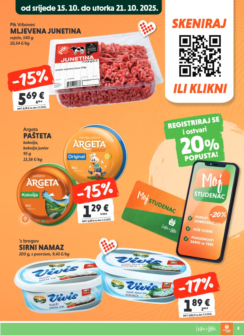 skeniraj ili klikni 3 registriraj se i ostvari 20 % popusta! 5 69 € mpc 6,72 € na dan 2.5.2025. 6 72 € -15% pik vrbovec mljevena junetina svježe, 540 g 10,54 €/kg argeta pašteta kokošja, kokošja junior 95 g 13,58 €/kg 1 29 € mpc 1,52 € na dan 2.5.2025. 1,52 € -15% 'z bregov sirni namaz 200 g, s povrćem, 9,45 €/kg 1 89 € mpc 2,81 € na dan 2.5.2025. 2 25 € -17% od srijede 15. 10. do utorka 21. 10. 2025.
