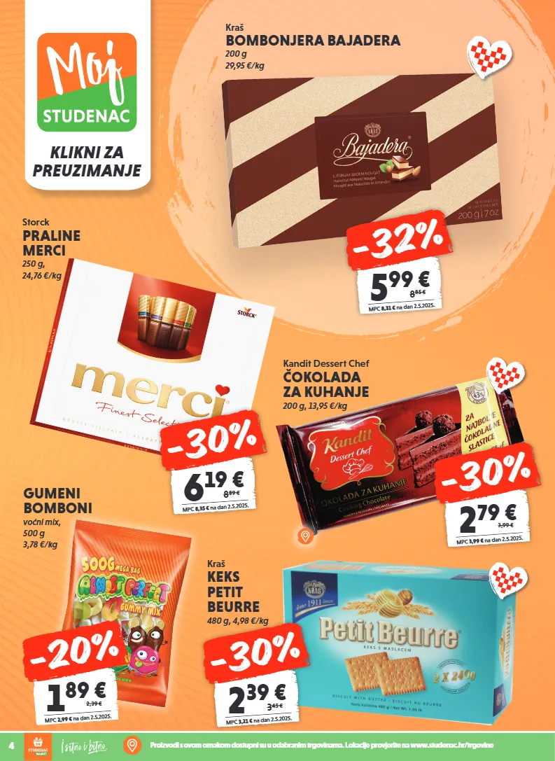 klikni za preuzimanje 4 proizvodi s ovom oznakom dostupni su u odabranim trgovinama. lokacije provjerite na www.studenac.hr/trgovine 2 79 € mpc 3,99 € na dan 2.5.2025. 3,99 € -30% kandit dessert chef čokolada za kuhanje 200 g, 13,95 €/kg 6 19 € mpc 8,35 € na dan 2.5.2025. 8 89 € -30% storck praline merci 250 g, 24,76 €/kg 2 39 € mpc 3,21 € na dan 2.5.2025. 3 45 € -30% kraš keks petit beurre 480 g, 4,98 €/kg 5 99 € mpc 8,31 € na dan 2.5.2025. 8 85 € -32% kraš bombonjera bajadera 200 g 29,95 €/kg 1 89 € mpc 2,99 € na dan 2.5.2025. 2,39 € -20% gumeni bomboni voćni mix, 500 g 3,78 €/kg
