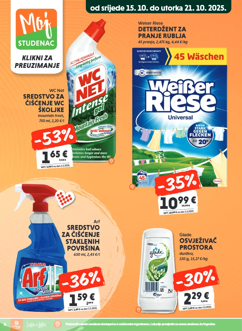 6 proizvodi s ovom oznakom dostupni su u odabranim trgovinama. lokacije provjerite na www.studenac.hr/trgovine 2 29 € mpc 3,29 € na dan 2.5.2025. 3,29 € -30% glade osvježivač prostora đurđica, 150 g, 15,27 €/kg 1 65 € mpc 3,54 € na dan 2.5.2025. 3,54 € -53% wc net sredstvo za čišćenje wc školjke mountain fresh, 750 ml, 2,20 €/l 10 99 € mpc 16,99 € na dan 2.5.2025. 16,99 € -35% weiser riese deterdžent za pranje rublja 45 pranja, 2,475 kg, 4,44 €/kg arf sredstvo za čišćenje staklenih površina 650 ml, 2,45 €/l 1 59 € mpc 2,49 € na dan 2.5.2025. 2 49 € -36% klikni za preuzimanje od srijede 15. 10. do utorka 21. 10. 2025.