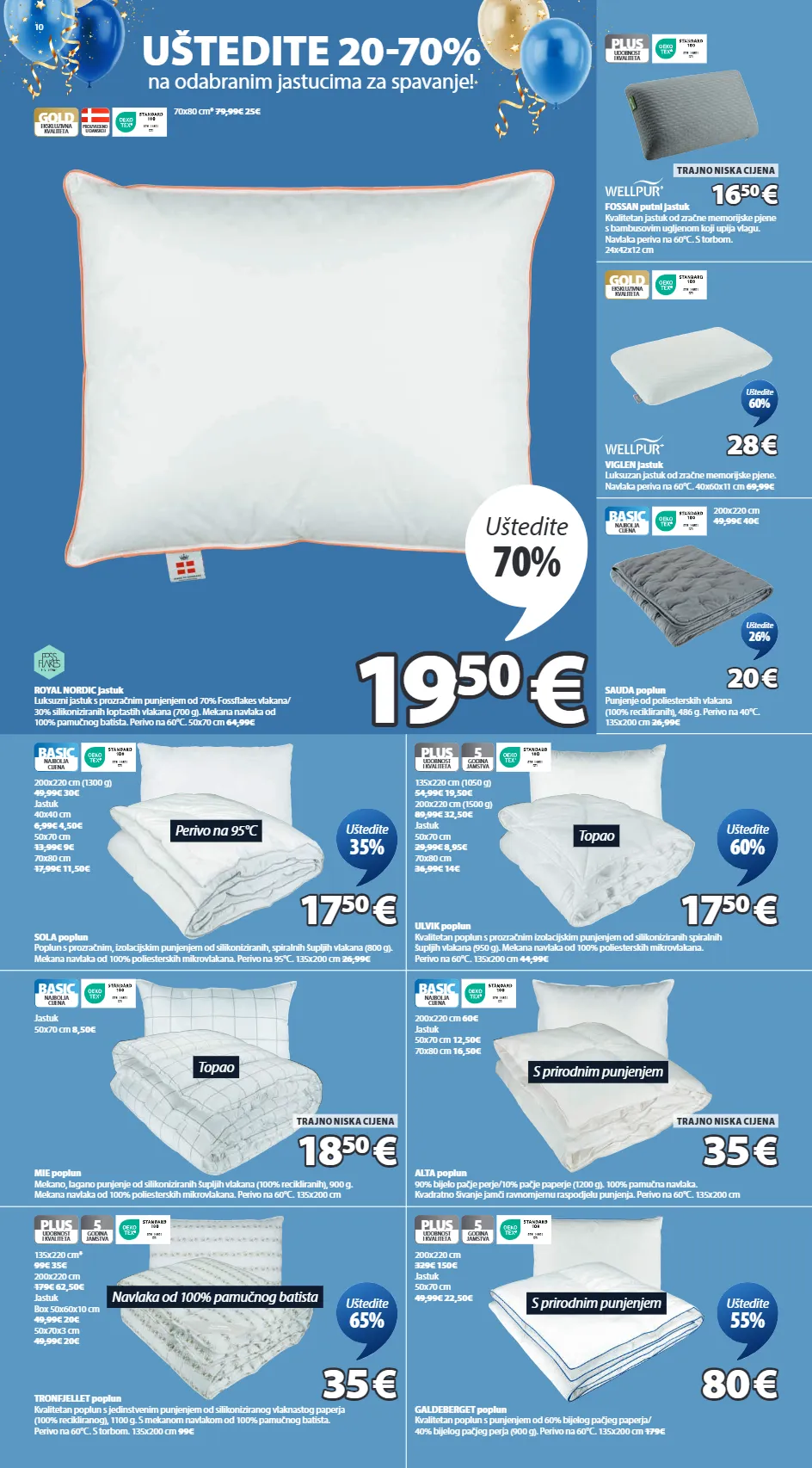 10 uštedite 20-70% na odabranim jastucima za spavanje! 9 7 6 - 1 4 6 0 1 d t i gold ekskluzivna kvaliteta proizvedeno u danskoj royal nordic jastuk luksuzni jastuk s prozračnim punjenjem od 70% fossflakes vlakana/ 30% silikoniziranih loptastih vlakana (700 g). mekana navlaka od 100% pamučnog batista. perivo na 60°c. 50x70 cm 64,99€ 70x80 cm* 79,99€ 25€ 19 19 50 50 € € uštedite 70% 9 7 6 - 1 4 6 0 1 d t i basic najbolja cijena sola poplun poplun s prozračnim, izolacijskim punjenjem od silikoniziranih, spiralnih šupljih vlakana (800 g). mekana navlaka od 100% poliesterskih mikrovlakana. perivo na 95°c. 135x200 cm 26,99€ 200x220 cm (1300 g) 49,99€ 30€ jastuk 40x40 cm 6,99€ 4,50€ 50x70 cm 13,99€ 9€ 70x80 cm 17,99€ 11,50€ 17 17 50 50 € € uštedite 35% 9 7 6 - 1 4 6 0 1 d t i basic najbolja cijena mie poplun mekano, lagano punjenje od silikoniziranih šupljih vlakana (100% recikliranih), 900 g. mekana navlaka od 100% poliesterskih mikrovlakana. perivo na 60°c. 135x200 cm jastuk 50x70 cm 8,50€ 18 18 50 50 € € trajno niska cijena 9 7 6 - 1 4 6 0 1 d t i plus udobnost i kvaliteta 5 godina jamstva ulvik poplun kvalitetan poplun s prozračnim izolacijskim punjenjem od silikoniziranih spiralnih šupljih vlakana (950 g). mekana navlaka od 100% poliesterskih mikrovlakana. perivo na 60°c. 135x200 cm 44,99€ 135x220 cm (1050 g) 54,99€ 19,50€ 200x220 cm (1500 g) 89,99€ 32,50€ jastuk 50x70 cm 29,99€ 8,95€ 70x80 cm 36,99€ 14€ 17 17 50 50 € € uštedite 60% 9 7 6 - 1 4 6 0 1 d t i basic najbolja cijena alta poplun 90% bijelo pačje perje/10% pačje paperje (1200 g). 100% pamučna navlaka. kvadratno šivanje jamči ravnomjernu raspodjelu punjenja. perivo na 60°c. 135x200 cm 200x220 cm 60€ jastuk 50x70 cm 12,50€ 70x80 cm 16,50€ 35 35 € € trajno niska cijena 9 7 6 - 1 4 6 0 1 d t i plus udobnost i kvaliteta 5 godina jamstva tronfjellet poplun kvalitetan poplun s jedinstvenim punjenjem od silikoniziranog vlaknastog paperja (100% recikliranog), 1100 g. s mekanom navlakom od 100% pamučnog batista. perivo na 60°c. s torbom. 135x200 cm 99€ 135x220 cm* 99€ 35€ 200x220 cm 179€ 62,50€ jastuk box 50x60x10 cm 49,99€ 20€ 50x70x3 cm 49,99€ 20€ 35 35 € € uštedite 65% perivo na 95°c topao topao s prirodnim punjenjem navlaka od 100% pamučnog batista s prirodnim punjenjem 9 7 6 - 1 4 6 0 1 d t i plus udobnost i kvaliteta 5 godina jamstva galdeberget poplun kvalitetan poplun s punjenjem od 60% bijelog pačjeg paperja/ 40% bijelog pačjeg perja (900 g). perivo na 60°c. 135x200 cm 179€ 200x220 cm 329€ 150€ jastuk 50x70 cm 49,99€ 22,50€ 80 80 € € uštedite 55% 9 7 6 - 1 4 6 0 1 d t i plus udobnost i kvaliteta fossan putni jastuk kvalitetan jastuk od zračne memorijske pjene s bambusovim ugljenom koji upija vlagu. navlaka periva na 60°c. s torbom. 24x42x12 cm 16 16 50 50 € € trajno niska cijena 9 7 6 - 1 4 6 0 1 d t i gold ekskluzivna kvaliteta viglen jastuk luksuzan jastuk od zračne memorijske pjene. navlaka periva na 60°c. 40x60x11 cm 69,99€ 28 28 € € uštedite 60% 9 7 6 - 1 4 6 0 1 d t i basic najbolja cijena sauda poplun punjenje od poliesterskih vlakana (100% recikliranih), 486 g. perivo na 40°c. 135x200 cm 26,99€ 200x220 cm 49,99€ 40€ 20 20 € € uštedite 26% 4316904 4015550 4216504 4122950 4330604 4134650 4334604 4028150 4312904 4151050 4330404 4011550 4238501 4245400 4121050 4330704