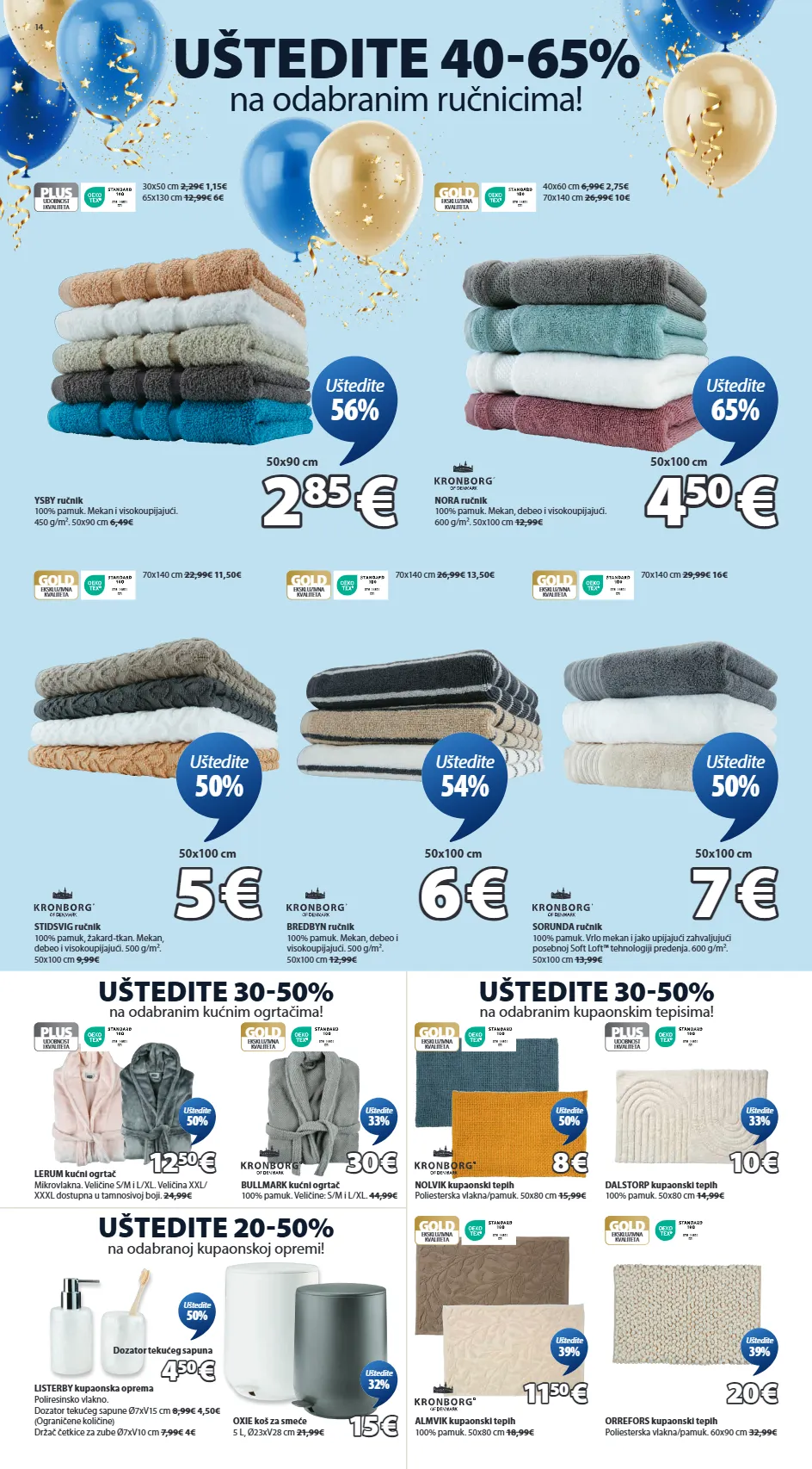 14 uštedite 40-65% na odabranim ručnicima! nora ručnik 100% pamuk. mekan, debeo i visokoupijajući. 600 g/m². 50x100 cm 12,99€ 9 7 6 - 1 4 6 0 1 d t i gold ekskluzivna kvaliteta 40x60 cm 6,99€ 2,75€ 70x140 cm 26,99€ 10€ 4 4 50 50 € € 50x100 cm uštedite 65% ysby ručnik 100% pamuk. mekan i visokoupijajući. 450 g/m². 50x90 cm 6,49€ 9 7 6 - 1 4 6 0 1 d t i plus udobnost i kvaliteta 30x50 cm 2,29€ 1,15€ 65x130 cm 12,99€ 6€ 2 2 85 85 € € 50x90 cm uštedite 56% stidsvig ručnik 100% pamuk, žakard-tkan. mekan, debeo i visokoupijajući. 500 g/m². 50x100 cm 9,99€ 9 7 6 - 1 4 6 0 1 d t i gold ekskluzivna kvaliteta 70x140 cm 22,99€ 11,50€ 5 5 € € 50x100 cm uštedite 50% bredbyn ručnik 100% pamuk. mekan, debeo i visokoupijajući. 500 g/m². 50x100 cm 12,99€ 9 7 6 - 1 4 6 0 1 d t i gold ekskluzivna kvaliteta 70x140 cm 26,99€ 13,50€ 6 6 € € 50x100 cm uštedite 54% sorunda ručnik 100% pamuk. vrlo mekan i jako upijajući zahvaljujući posebnoj soft loft™ tehnologiji predenja. 600 g/m². 50x100 cm 13,99€ 9 7 6 - 1 4 6 0 1 d t i gold ekskluzivna kvaliteta 70x140 cm 29,99€ 16€ 7 7 € € 50x100 cm uštedite 50% 9 7 6 - 1 4 6 0 1 d t i plus udobnost i kvaliteta lerum kućni ogrtač mikrovlakna. veličine s/m i l/xl. veličina xxl/ xxxl dostupna u tamnosivoj boji. 24,99€ uštedite 30-50% na odabranim kućnim ogrtačima! 12 12 50 50 € € uštedite 50% 9 7 6 - 1 4 6 0 1 d t i gold ekskluzivna kvaliteta bullmark kućni ogrtač 100% pamuk. veličine: s/m i l/xl. 44,99€ 30 30 € € uštedite 33% 9 7 6 - 1 4 6 0 1 d t i gold ekskluzivna kvaliteta nolvik kupaonski tepih poliesterska vlakna/pamuk. 50x80 cm 15,99€ uštedite 30-50% na odabranim kupaonskim tepisima! 8 8 € € uštedite 50% 9 7 6 - 1 4 6 0 1 d t i plus udobnost i kvaliteta dalstorp kupaonski tepih 100% pamuk. 50x80 cm 14,99€ 10 10 € € uštedite 33% 9 7 6 - 1 4 6 0 1 d t i gold ekskluzivna kvaliteta almvik kupaonski tepih 100% pamuk. 50x80 cm 18,99€ 11 11 50 50 € € uštedite 39% 9 7 6 - 1 4 6 0 1 d t i gold ekskluzivna kvaliteta orrefors kupaonski tepih poliesterska vlakna/pamuk. 60x90 cm 32,99€ 20 20 € € uštedite 39% listerby kupaonska oprema poliresinsko vlakno. dozator tekućeg sapune ø7xv15 cm 8,99€ 4,50€ (ograničene količine) držač četkice za zube ø7xv10 cm 7,99€ 4€ uštedite 20-50% na odabranoj kupaonskoj opremi! 4 4 50 50 € € dozator tekućeg sapuna uštedite 50% oxie koš za smeće 5 l, ø23xv28 cm 21,99€ 15 15 € € uštedite 32% 2101601 2121601 2134601 2346101 2118901 2814218 2814241 2813142 2513805 2513842 2519212 2521902 2521951 2515100 2772301 2772401 2762501 2762541