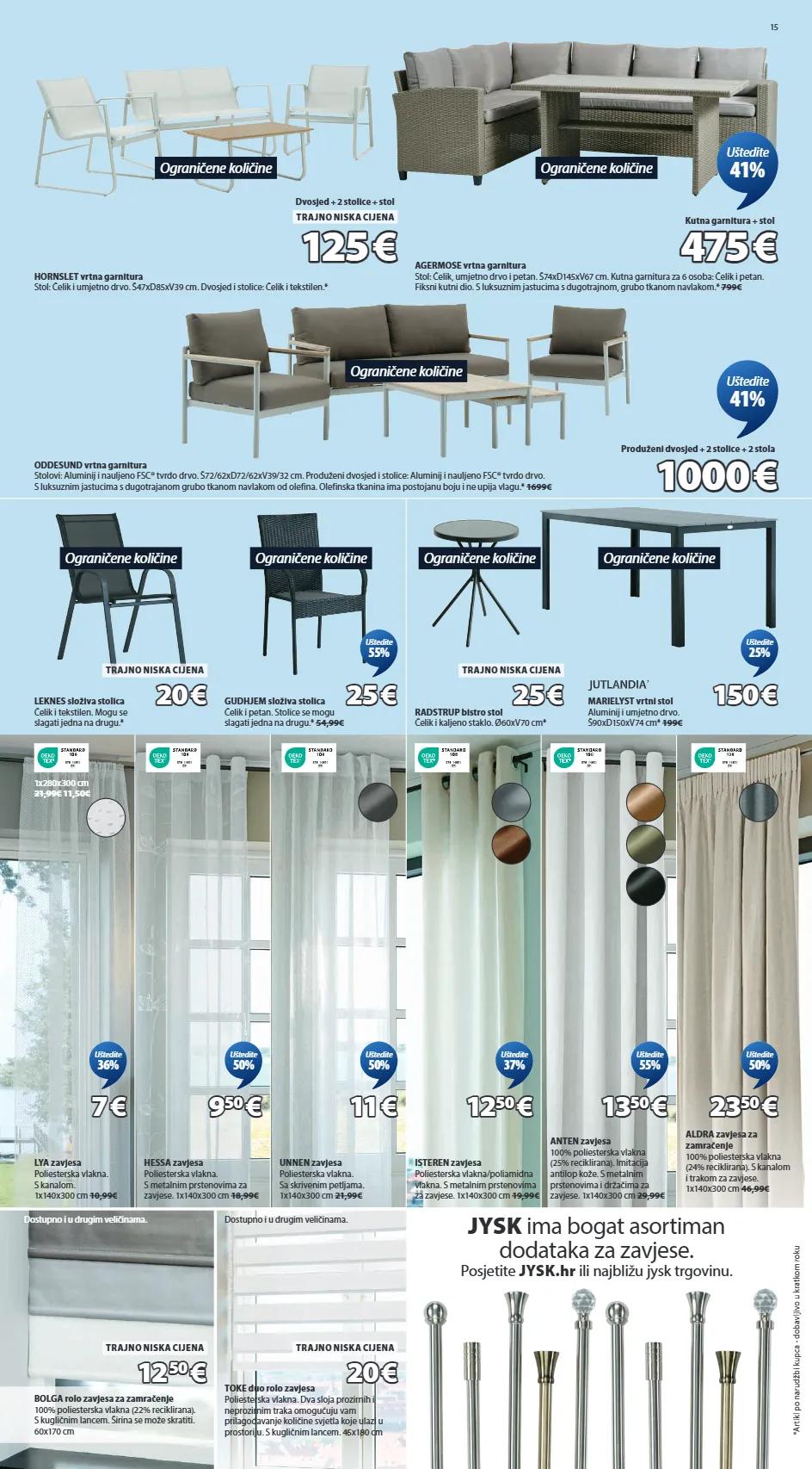 15 lya zavjesa poliesterska vlakna. s kanalom. 1x140x300 cm 10,99€ 9 7 6 - 1 4 6 0 1 d t i 1x280x300 cm 21,99€ 11,50€ 7 7 € € uštedite 36% 9 7 6 - 1 4 6 0 1 d t i hessa zavjesa poliesterska vlakna. s metalnim prstenovima za zavjese. 1x140x300 cm 18,99€ 9 9 50 50 € € uštedite 50% 9 7 6 - 1 4 6 0 1 d t i unnen zavjesa poliesterska vlakna. sa skrivenim petljama. 1x140x300 cm 21,99€ 11 11 € € uštedite 50% 9 7 6 - 1 4 6 0 1 d t i isteren zavjesa poliesterska vlakna/poliamidna vlakna. s metalnim prstenovima za zavjese. 1x140x300 cm 19,99€ 12 12 50 50 € € uštedite 37% 9 7 6 - 1 4 6 0 1 d t i anten zavjesa 100% poliesterska vlakna (25% reciklirana). imitacija antilop kože. s metalnim prstenovima i držačima za zavjese. 1x140x300 cm 29,99€ 13 13 50 50 € € uštedite 55% 9 7 6 - 1 4 6 0 1 d t i aldra zavjesa za zamračenje 100% poliesterska vlakna (24% reciklirana). s kanalom i trakom za zavjese. 1x140x300 cm 46,99€ 23 23 50 50 € € uštedite 50% jysk ima bogat asortiman dodataka za zavjese. posjetite jysk.hr ili najbližu jysk trgovinu. bolga rolo zavjesa za zamračenje 100% poliesterska vlakna (22% reciklirana). s kugličnim lancem. širina se može skratiti. 60x170 cm dostupno i u drugim veličinama. 12 12 50 50 € € trajno niska cijena toke duo rolo zavjesa poliesterska vlakna. dva sloja prozirnih i neprozirnim traka omogućuju vam prilagođavanje količine svjetla koje ulazi u prostoriju. s kugličnim lancem. 45x180 cm dostupno i u drugim veličinama. 20 20 € € trajno niska cijena hornslet vrtna garnitura stol: čelik i umjetno drvo. š47xd85xv39 cm. dvosjed i stolice: čelik i tekstilen.* 125 125 € € dvosjed + 2 stolice + stol trajno niska cijena agermose vrtna garnitura stol: čelik, umjetno drvo i petan. š74xd145xv67 cm. kutna garnitura za 6 osoba: čelik i petan. fiksni kutni dio. s luksuznim jastucima s dugotrajnom, grubo tkanom navlakom.* 799€ 475 475 € € kutna garnitura + stol uštedite 41% oddesund vrtna garnitura stolovi: aluminij i nauljeno fsc® tvrdo drvo. š72/62xd72/62xv39/32 cm. produženi dvosjed i stolice: aluminij i nauljeno fsc® tvrdo drvo. s luksuznim jastucima s dugotrajanom grubo tkanom navlakom od olefina. olefinska tkanina ima postojanu boju i ne upija vlagu.* 1699€ uštedite 41% 1000 1000 € € produženi dvosjed + 2 stolice + 2 stola leknes složiva stolica čelik i tekstilen. mogu se slagati jedna na drugu.* 20 20 € € trajno niska cijena gudhjem složiva stolica čelik i petan. stolice se mogu slagati jedna na drugu.* 54,99€ 25 25 € € uštedite 55% radstrup bistro stol čelik i kaljeno staklo. ø60xv70 cm* 25 25 € € trajno niska cijena marielyst vrtni stol aluminij i umjetno drvo. š90xd150xv74 cm* 199€ 150 150 € € uštedite 25% *artikl po narudžbi kupca - dobavljivo u kratkom roku ograničene količine ograničene količine ograničene količine ograničene količine ograničene količine ograničene količine ograničene količine 5093901 5094021 5090801 5094201 5094442 5080002 5080003 5080005 5097600 5097607 5097627 5097663 5097307 5097442 5219700 5530833 5532500 3725058 3700515 3725028 3786940 3700432 3725109 3725014