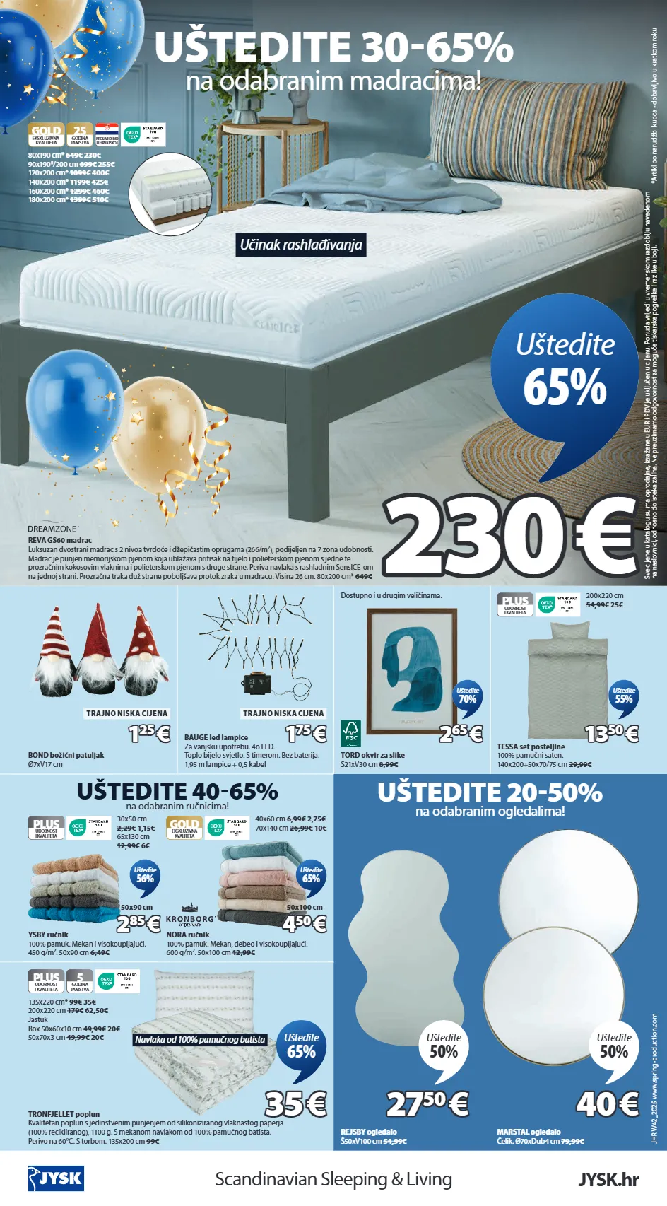 scandinavian sleeping & living jysk.hr uštedite 30-65% na odabranim madracima! jhr w42_2025 www.spring-production.com reva gs60 madrac luksuzan dvostrani madrac s 2 nivoa tvrdoće i džepičastim oprugama (266/m²), podijeljen na 7 zona udobnosti. madrac je punjen memorijskom pjenom koja ublažava pritisak na tijelo i polieterskom pjenom s jedne te prozračnim kokosovim vlaknima i polieterskom pjenom s druge strane. periva navlaka s rashladnim sensice-om na jednoj strani. prozračna traka duž strane poboljšava protok zraka u madracu. visina 26 cm. 80x200 cm* 649€ 9 7 6 - 1 4 6 0 1 d t i gold 25 godina jamstva ekskluzivna kvaliteta proizvedeno u hrvatskoj 80x190 cm* 649€ 230€ 90x190*/200 cm 699€ 255€ 120x200 cm* 1099€ 400€ 140x200 cm* 1199€ 425€ 160x200 cm* 1299€ 460€ 180x200 cm* 1399€ 510€ 230 230 € € uštedite 65% učinak rashlađivanja uštedite 40-65% na odabranim ručnicima! ysby ručnik 100% pamuk. mekan i visokoupijajući. 450 g/m². 50x90 cm 6,49€ 9 7 6 - 1 4 6 0 1 d t i plus udobnost i kvaliteta 30x50 cm 2,29€ 1,15€ 65x130 cm 12,99€ 6€ 2 2 85 85 € € 50x90 cm uštedite 56% nora ručnik 100% pamuk. mekan, debeo i visokoupijajući. 600 g/m². 50x100 cm 12,99€ 9 7 6 - 1 4 6 0 1 d t i gold ekskluzivna kvaliteta 40x60 cm 6,99€ 2,75€ 70x140 cm 26,99€ 10€ 4 4 50 50 € € 50x100 cm uštedite 65% uštedite 20-50% na odabranim ogledalima! rejsby ogledalo š50xv100 cm 54,99€ 27 27 50 50 € € uštedite 50% 40 40 € € uštedite 50% navlaka od 100% pamučnog batista tronfjellet poplun kvalitetan poplun s jedinstvenim punjenjem od silikoniziranog vlaknastog paperja (100% recikliranog), 1100 g. s mekanom navlakom od 100% pamučnog batista. perivo na 60°c. s torbom. 135x200 cm 99€ 9 7 6 - 1 4 6 0 1 d t i plus udobnost i kvaliteta 5 godina jamstva 135x220 cm* 99€ 35€ 200x220 cm 179€ 62,50€ jastuk box 50x60x10 cm 49,99€ 20€ 50x70x3 cm 49,99€ 20€ 35 35 € € uštedite 65% bond božićni patuljak ø7xv17 cm 1 1 25 25 € € trajno niska cijena www.fsc.org ® ® fsc n001715 tord okvir za slike š21xv30 cm 8,99€ dostupno i u drugim veličinama. 2 2 65 65 € € uštedite 70% bauge led lampice za vanjsku upotrebu. 4o led. toplo bijelo svjetlo. s timerom. bez baterija. 1,95 m lampice + 0,5 kabel 1 1 75 75 € € trajno niska cijena tessa set posteljine 100% pamučni saten. 140x200+50x70/75 cm 29,99€ 9 7 6 - 1 4 6 0 1 d t i plus udobnost i kvaliteta 200x220 cm 54,99€ 25€ 13 13 50 50 € € uštedite 55% sve cijene u katalogu su maloprodajne, izražene u eur i pdv je uključen u cijenu. ponuda vrijedi u vremenskom razdoblju navedenom na naslovnici, odnosno do isteka zaliha. ne preuzimamo odgovornost za moguće tiskarske pogreške i razlike u boji. *artikl po narudžbi kupca - dobavljivo u kratkom roku marstal ogledalo čelik. ø70xdub4 cm 79,99€ 3370823 2121601 2101601 3670123 4151050 6112137 4912590 6112052 1831180 4330404 3690376 3690375