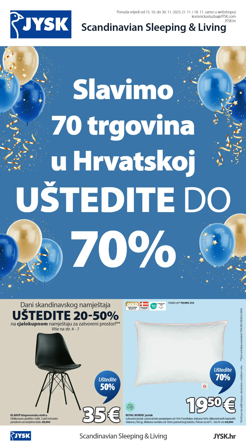 scandinavian sleeping & living scandinavian sleeping & living jysk.hr ponuda vrijedi od 15. 10. do 30. 11. 2025. (1. 11. i 18. 11. samo u webshopu) korisnickasluzba@jysk.com jysk.hr klarup blagovaonska stolica oblikovano sjedište i čelik. s pričvršćenim jastukom od umjetne kože. 69,99€ 35 35 € € uštedite 50% dani skandinavskog namještaja uštedite 20-50% na cjelokupnom namještaju za zatvoreni prostor!** više na str. 4 - 7 royal nordic jastuk luksuzni jastuk s prozračnim punjenjem od 70% fossflakes vlakana/30% silikoniziranih loptastih vlakana (700 g). mekana navlaka od 100% pamučnog batista. perivo na 60°c. 50x70 cm 64,99€ 9 7 6 - 1 4 6 0 1 d t i gold ekskluzivna kvaliteta proizvedeno u danskoj 70x80 cm* 79,99€ 25€ 19 19 50 50 € € uštedite 70% slavimo 70 trgovina u hrvatskoj uštedite do 70% *artikl po narudžbi kupca - dobavljivo u kratkom roku **osim artikala s oznakom trajno niska cijena 3601223 4316904