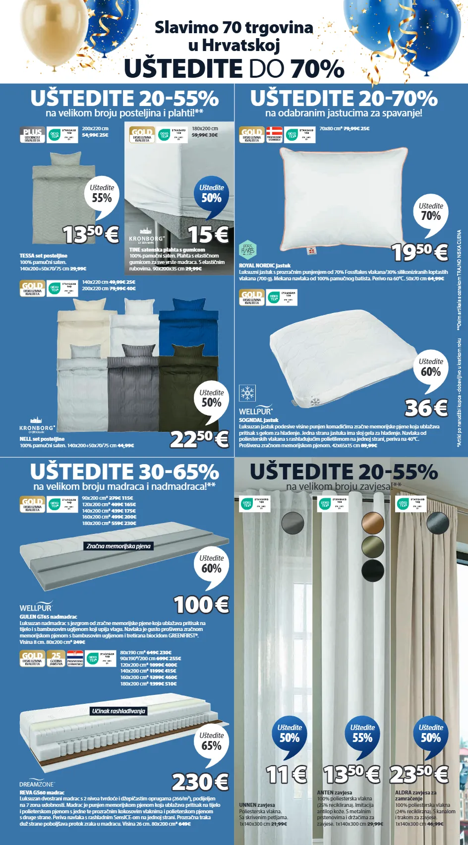 3 uštedite 20-55% na velikom broju posteljina i plahti!** uštedite 30-65% na velikom broju madraca i nadmadraca!** uštedite 20-55% na velikom broju zavjesa!** uštedite 20-70% na odabranim jastucima za spavanje! tessa set posteljine 100% pamučni saten. 140x200+50x70/75 cm 29,99€ 9 7 6 - 1 4 6 0 1 d t i plus udobnost i kvaliteta 200x220 cm 54,99€ 25€ 13 13 50 50 € € uštedite 55% tine satenska plahta s gumicom 100% pamučni saten. plahta s elastičnom gumicom za sve vrste madraca. s elastičnim rubovima. 90x200x35 cm 29,99€ 9 7 6 - 1 4 6 0 1 d t i gold ekskluzivna kvaliteta 180x200 cm 59,99€ 30€ 15 15 € € uštedite 50% nell set posteljine 100% pamučni saten. 140x200+50x70/75 cm 44,99€ 9 7 6 - 1 4 6 0 1 d t i gold ekskluzivna kvaliteta 140x220 cm 49,99€ 25€ 200x220 cm 79,99€ 40€ 22 22 50 50 € € uštedite 50% royal nordic jastuk luksuzni jastuk s prozračnim punjenjem od 70% fossflakes vlakana/30% silikoniziranih loptastih vlakana (700 g). mekana navlaka od 100% pamučnog batista. perivo na 60°c. 50x70 cm 64,99€ 9 7 6 - 1 4 6 0 1 d t i gold ekskluzivna kvaliteta proizvedeno u danskoj 70x80 cm* 79,99€ 25€ 19 19 50 50 € € uštedite 70% 9 7 6 - 1 4 6 0 1 d t i gold ekskluzivna kvaliteta sogndal jastuk luksuzan jastuk podesive visine punjen komadićima zračne memorijske pjene koja ublažava pritisak s gelom za hlađenje. jedna strana jastuka ima sloj gela za hlađenje. navlaka od poliesterskih vlakana s rashlađujućim polietilenom na jednoj strani, periva na 40°c. prošivena zračnom memorijskom pjenom. 42x65x15 cm 89,99€ 36 36 € € uštedite 60% zračna memorijska pjena gulen gt65 nadmadrac luksuzan nadmadrac s jezgrom od zračne memorijske pjene koja ublažava pritisak na tijelo i s bambusovim ugljenom koji upija vlagu. navlaka je gusto prošivena zračnom memorijskom pjenom s bambusovim ugljenom i tretirana biocidom greenfirst®. visina 8 cm. 80x200 cm* 249€ 9 7 6 - 1 4 6 0 1 d t i gold ekskluzivna kvaliteta 90x200 cm* 279€ 115€ 120x200 cm* 409€ 165€ 140x200 cm* 439€ 175€ 160x200 cm* 499€ 200€ 180x200 cm* 559€ 230€ 100 100 € € uštedite 60% učinak rashlađivanja reva gs60 madrac luksuzan dvostrani madrac s 2 nivoa tvrdoće i džepičastim oprugama (266/m²), podijeljen na 7 zona udobnosti. madrac je punjen memorijskom pjenom koja ublažava pritisak na tijelo i polieterskom pjenom s jedne te prozračnim kokosovim vlaknima i polieterskom pjenom s druge strane. periva navlaka s rashladnim sensice-om na jednoj strani. prozračna traka duž strane poboljšava protok zraka u madracu. visina 26 cm. 80x200 cm* 649€ 9 7 6 - 1 4 6 0 1 d t i gold 25 godina jamstva ekskluzivna kvaliteta proizvedeno u hrvatskoj 80x190 cm* 649€ 230€ 90x190*/200 cm 699€ 255€ 120x200 cm* 1099€ 400€ 140x200 cm* 1199€ 415€ 160x200 cm* 1299€ 460€ 180x200 cm* 1399€ 510€ 230 230 € € uštedite 65% 9 7 6 - 1 4 6 0 1 d t i unnen zavjesa poliesterska vlakna. sa skrivenim petljama. 1x140x300 cm 21,99€ 11 11 € € uštedite 50% 9 7 6 - 1 4 6 0 1 d t i anten zavjesa 100% poliesterska vlakna (25% reciklirana). imitacija antilop kože. s metalnim prstenovima i držačima za zavjese. 1x140x300 cm 29,99€ 13 13 50 50 € € uštedite 55% 9 7 6 - 1 4 6 0 1 d t i aldra zavjesa za zamračenje 100% poliesterska vlakna (24% reciklirana). s kanalom i trakom za zavjese. 1x140x300 cm 46,99€ 23 23 50 50 € € uštedite 50% *artikl po narudžbi kupca - dobavljivo u kratkom roku **osim artikala s oznakom trajno niska cijena slavimo 70 trgovina u hrvatskoj uštedite do 70% 1831180 1425001 1832580 7391580 7390580 7391680 7391780 1845580 4316904 4249204 3439823 3370823 5094201 5094442 5097600 5097607 5097627 5097663 5097307 5097442