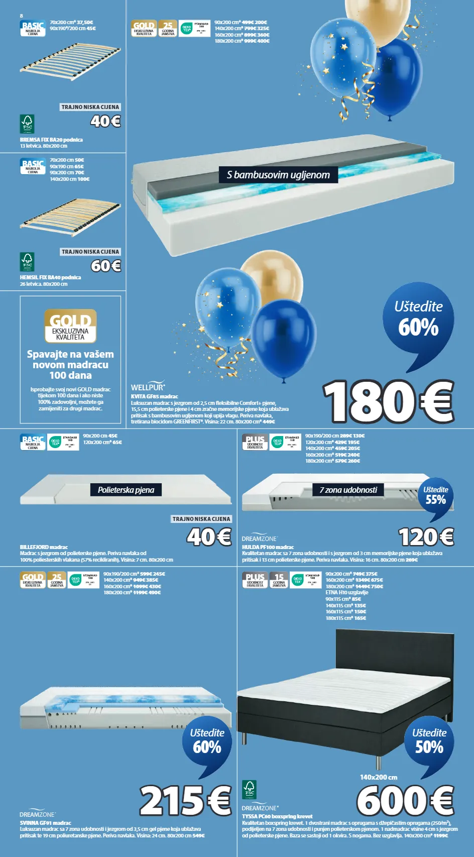 8 9 7 6 - 1 4 6 0 1 d t i gold 25 godina jamstva ekskluzivna kvaliteta kvita gf85 madrac luksuzan madrac s jezgrom od 2,5 cm fleksibilne comfort+ pjene, 15,5 cm polieterske pjene i 4 cm zračne memorijske pjene koja ublažava pritisak s bambusovim ugljenom koji upija vlagu. periva navlaka, tretirana biocidom greenfirst®. visina: 22 cm. 80x200 cm* 449€ 90x200 cm* 499€ 200€ 140x200 cm* 799€ 325€ 160x200 cm* 899€ 360€ 180x200 cm* 999€ 400€ 180 180 € € uštedite 60% 9 7 6 - 1 4 6 0 1 d t i basic najbolja cijena billefjord madrac madrac s jezgrom od polieterske pjene. periva navlaka od 100% poliesterskih vlakana (57% recikliranih). visina: 7 cm. 80x200 cm 90x200 cm 45€ 120x200 cm* 65€ 40 40 € € trajno niska cijena 9 7 6 - 1 4 6 0 1 d t i plus udobnost i kvaliteta hulda pf100 madrac kvalitetan madrac sa 7 zona udobnosti i s jezgrom od 3 cm memorijske pjene koja ublažava pritisak i 13 cm polieterske pjene. periva navlaka. visina: 16 cm. 80x200 cm 269€ 90x190/200 cm 289€ 130€ 120x200 cm* 429€ 195€ 140x200 cm* 459€ 205€ 160x200 cm* 519€ 240€ 180x200 cm* 579€ 260€ 120 120 € € uštedite 55% 9 7 6 - 1 4 6 0 1 d t i gold 25 godina jamstva ekskluzivna kvaliteta svinna gf91 madrac luksuzan madrac sa 7 zona udobnosti i jezgrom od 3,5 cm gel pjene koja ublažava pritisak te 19 cm poliuretanske pjene. periva navlaka. visina: 24 cm. 80x200 cm 549€ 90x190/200 cm* 599€ 245€ 140x200 cm* 949€ 385€ 160x200 cm* 1099€ 430€ 180x200 cm* 1199€ 490€ 215 215 € € www.fsc.org ® ® fsc n001715 9 7 6 - 1 4 6 0 1 d t i plus udobnost i kvaliteta 15 godina jamstva tyssa pc60 boxspring krevet kvalitetan boxspring krevet. 1 dvostrani madrac s oprugama s džepičastim oprugama (250/m²), podijeljen na 7 zona udobnosti i punjen polieterskom pjenom. 1 nadmadrac visine 4 cm s jezgrom od polieterske pjene. baza se sastoji od 1 okvira. s nogama. bez uzglavlja. 140x200 cm* 1199€ 90x200 cm* 749€ 375€ 160x200 cm* 1349€ 675€ 180x200 cm* 1449€ 750€ etna h10 uzglavlje 90x115 cm* 85€ 140x115 cm* 135€ 160x115 cm* 150€ 180x115 cm* 165€ 600 600 € € 140x200 cm uštedite 50% uštedite 60% www.fsc.org ® ® fsc n001715 basic najbolja cijena bremsa fix ba20 podnica 13 letvica. 80x200 cm 70x200 cm* 37,50€ 90x190*/200 cm 45€ 40 40 € € trajno niska cijena www.fsc.org ® ® fsc n001715 basic najbolja cijena hemsil fix ba40 podnica 26 letvica. 80x200 cm 70x200 cm 50€ 90x190 cm 65€ 90x200 cm 70€ 140x200 cm 100€ 60 60 € € trajno niska cijena gold ekskluzivna kvaliteta spavajte na vašem novom madracu 100 dana isprobajte svoj novi gold madrac tijekom 100 dana i ako niste 100% zadovoljni, možete ga zamijeniti za drugi madrac. polieterska pjena 7 zona udobnosti s bambusovim ugljenom 3378823 3271023 3269823 3278423 3247957 3537057 3529023 3529723