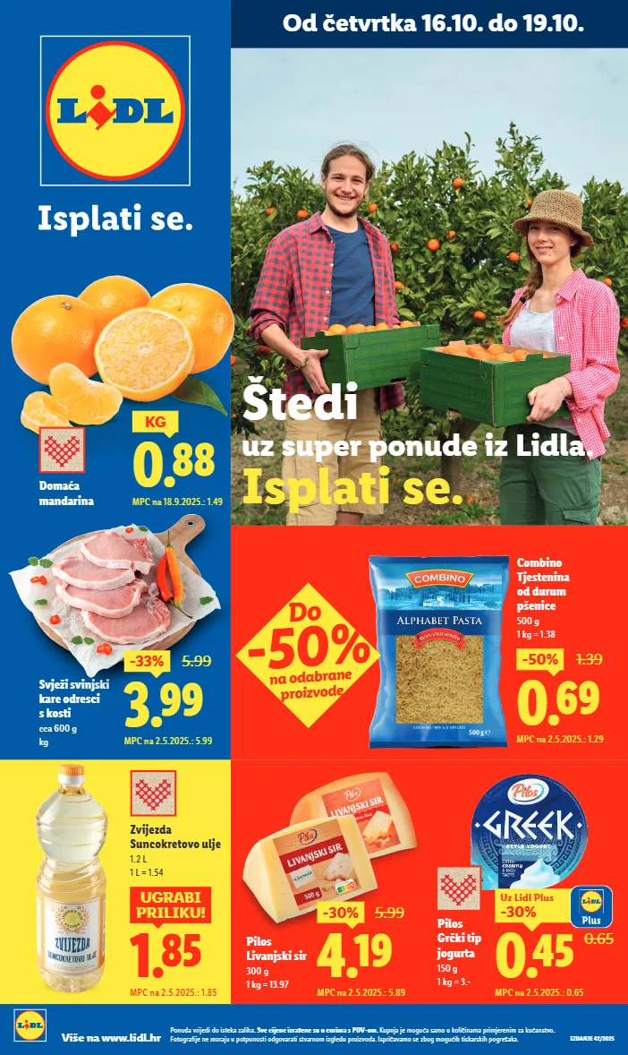 4.99 ugrabi priliku! mpc na 2.5.2025.: 4.49 prirodni sok od jabuke xxl 5 l 1 l = 1.- redovna cijena za 3 l = 4.65 mutni proizveden od prosječno 8.5 kg jabuka 2.69 1.89 -29% uz lidl plus mpc na 2.5.2025.: 2.49 ekstra džem od višanja 630 g 1 kg = 3.- uz lidl plus -40% 1.19 1.99 mpc na 2.5.2025.: 1.99 svježi fuži ili pljukanci 400 g 1 kg = 2.98 3.19 -32% 4.75 mpc na 2.5.2025.: 4.75 med lipa 450 g 1 kg = 7.09 do -40% na odabrane proizvode ponuda vrijedi do isteka zaliha. sve cijene izražene su u eurima s pdv-om. kupnja je moguća samo u količinama primjerenim za kućanstvo. fotografije ne moraju u potpunosti odgovarati stvarnom izgledu proizvoda. ispričavamo se zbog mogućih tiskarskih pogrešaka. više na www.lidl.hr od ponedjeljka 20.10. do 26.10.