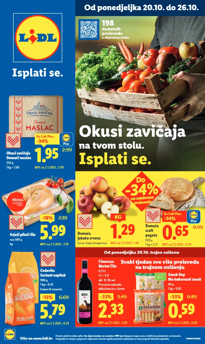 izdanje 43/2025 ponuda vrijedi do isteka zaliha. sve cijene izražene su u eurima s pdv-om. kupnja je moguća samo u količinama primjerenim za kućanstvo. fotografije ne moraju u potpunosti odgovarati stvarnom izgledu proizvoda. ispričavamo se zbog mogućih tiskarskih pogrešaka. više na www.lidl.hr od ponedjeljka 20.10. do 26.10. 2.99 1.95 -34% uz lidl plus mpc na 2.5.2025.: 2.99 okusi zavičaja domaći maslac 250 g 1 kg = 7.80 svježi pileći file cca 500 g kg 5.99 -18% 7.39 mpc na 2.5.2025.: 7.39 2. 33 -33% 3.49 mpc na 2.5.2025.: 3.49 cimarosa merlot čile 0.75 l 1 l = 3.11 alk. 12.5% vol povratna naknada uključena je u cijenu 0.59 -33% 0.89 mpc na 2.5.2025.: 0.89 snack day bio kukuruzni snack 60 g 1 kg = 9.83 na tvom stolu. isplati se. okusi zavičaja od ponedjeljka 20.10. trajno sniženo svaki tjedan sve više proizvoda na trajnom sniženju 5.79 -13% 6.69 mpc na 2.5.2025.: 6.39 cedevita instant napitak 900 g 1 kg = 6.43 limun ili naranča 0.99 0.65 -34% uz lidl plus mpc na 2.5.2025.: 0.99 domaća craft pogača 300 g 1 kg = 2.17 do -34% na odabrane proizvode 198 dodatnih proizvoda u digitalnom letku domaća jabuka crvena sorta: gala/jonaprince 1.29 kg mpc na 2.5.2025.: 1.49