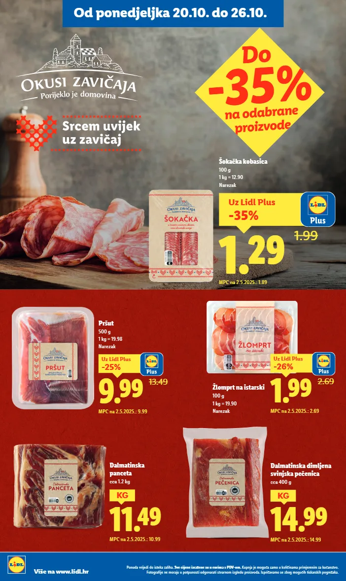 uz lidl plus -35% 1.29 1.99 mpc na 2.5.2025.: 1.89 šokačka kobasica 100 g 1 kg = 12.90 narezak 11.49 kg mpc na 2.5.2025.: 10.99 dalmatinska panceta cca 1.2 kg 13.49 9.99 -25% uz lidl plus mpc na 2.5.2025.: 9.99 pršut 500 g 1 kg = 19.98 narezak 2.69 1.99 -26% uz lidl plus mpc na 2.5.2025.: 2.69 žlomprt na istarski 100 g 1 kg = 19.90 narezak 14.99 kg mpc na 2.5.2025.: 14.99 dalmatinska dimljena svinjska pečenica cca 400 g do -35% na odabrane proizvode od ponedjeljka 20.10. do 26.10. ponuda vrijedi do isteka zaliha. sve cijene izražene su u eurima s pdv-om. kupnja je moguća samo u količinama primjerenim za kućanstvo. fotografije ne moraju u potpunosti odgovarati stvarnom izgledu proizvoda. ispričavamo se zbog mogućih tiskarskih pogrešaka. više na www.lidl.hr