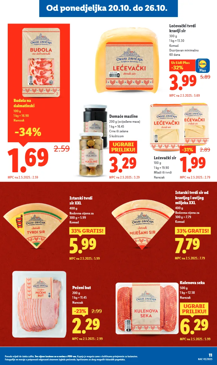 kulenova seka 500 g 1 kg = 12.58 narezak 6.29 ugrabi priliku! mpc na 2.5.2025.: 5.99 2.29 -23% 2.99 mpc na 2.5.2025.: 2.99 pečeni but 200 g 1 kg = 11.45 narezak 5.89 3.99 -32% uz lidl plus mpc na 2.5.2025.: 5.69 lećevački tvrdi kravlji sir 300 g 1 kg = 13.30 komad dozrijevan minimalno 60 dana 5.99 33% gratis! mpc na 2.5.2025.: 5.99 istarski tvrdi sir xxl 400 g redovna cijena za 300 g = 5.99 komad 7.79 33% gratis! mpc na 2.5.2025.: 7.79 istarski tvrdi sir od kravljeg i ovčjeg mlijeka xxl 400 g redovna cijena za 300 g = 7.79 komad 1.69 2.59 buđola na dalmatinski 100 g 1 kg = 16.90 narezak mpc na 2.5.2025.: 2.59 -34% 3.29 ugrabi priliku! mpc na 2.5.2025.: 3.29 domaće masline 200 g (ocijeđene mase) 1 kg = 16.45 crne ili zelene s košticom 1.99 -31% 2.89 mpc na 2.5.2025.: 2.79 lećevački sir 100 g 1 kg = 19.90 mladi ili tvrdi narezak 11 nac 43/2025 ponuda vrijedi do isteka zaliha. sve cijene izražene su u eurima s pdv-om. kupnja je moguća samo u količinama primjerenim za kućanstvo. fotografije ne moraju u potpunosti odgovarati stvarnom izgledu proizvoda. ispričavamo se zbog mogućih tiskarskih pogrešaka. od ponedjeljka 20.10. do 26.10.