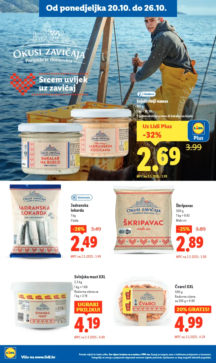 4.99 20% gratis! mpc na 2.5.2025.: 4.29 čvarci xxl 300 g redovna cijena za 250 g = 4.99 4.19 ugrabi priliku! mpc na 2.5.2025.: 4.89 svinjska mast xxl 2.5 kg 1 kg = 1.68 redovna cijena za 1 kg = 2.19 2.49 -28% 3.49 mpc na 2.5.2025.: 3.49 jadranska lokarda 1 kg cijela 2.89 -25% 3.89 mpc na 2.5.2025.: 3.89 škripavac 300 g 1 kg = 9.63 meki sir svježi riblji namaz 165 g 1 kg = 16.30 s jadranskim kozicama ili bakalar na bijelo uz lidl plus -32% 2.69 3.99 mpc na 2.5.2025.: 3.99 ponuda vrijedi do isteka zaliha. sve cijene izražene su u eurima s pdv-om. kupnja je moguća samo u količinama primjerenim za kućanstvo. fotografije ne moraju u potpunosti odgovarati stvarnom izgledu proizvoda. ispričavamo se zbog mogućih tiskarskih pogrešaka. više na www.lidl.hr od ponedjeljka 20.10. do 26.10.