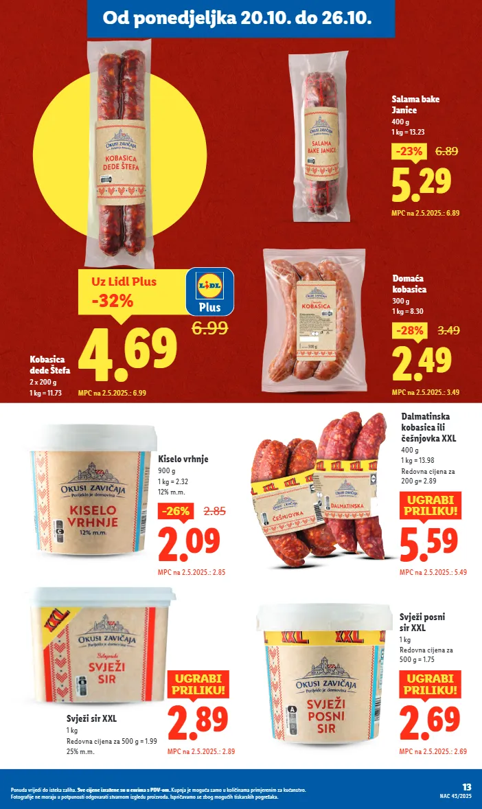 2.09 -26% 2.85 mpc na 2.5.2025.: 2.85 kiselo vrhnje 900 g 1 kg = 2.32 12% m.m. 2.89 ugrabi priliku! mpc na 2.5.2025.: 2.89 svježi sir xxl 1 kg redovna cijena za 500 g = 1.99 25% m.m. 5.29 -23% 6.89 mpc na 2.5.2025.: 6.89 salama bake janice 400 g 1 kg = 13.23 2.49 -28% 3.49 mpc na 2.5.2025.: 3.49 domaća kobasica 300 g 1 kg = 8.30 5.59 ugrabi priliku! mpc na 2.5.2025.: 5.49 dalmatinska kobasica ili češnjovka xxl 400 g 1 kg = 13.98 redovna cijena za 200 g= 2.89 2.69 ugrabi priliku! mpc na 2.5.2025.: 2.69 svježi posni sir xxl 1 kg redovna cijena za 500 g = 1.75 kobasica dede štefa 2 x 200 g 1 kg = 11.73 uz lidl plus -32% 4.69 6.99 mpc na 2.5.2025.: 6.99 13 nac 43/2025 ponuda vrijedi do isteka zaliha. sve cijene izražene su u eurima s pdv-om. kupnja je moguća samo u količinama primjerenim za kućanstvo. fotografije ne moraju u potpunosti odgovarati stvarnom izgledu proizvoda. ispričavamo se zbog mogućih tiskarskih pogrešaka. od ponedjeljka 20.10. do 26.10.