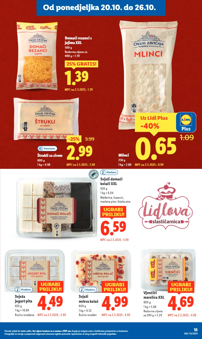 6.59 ugrabi priliku! mpc na 2.5.2025.: 5.99 svježi domaći kolači xxl 820 g 1 kg = 8.04 mađarica, čupavci, medena pita i bijela pita 4.49 ugrabi priliku! mpc na 2.5.2025.: 3.99 svježa jogurt pita 420 g 1 kg = 10.69 ručno izrađena 4.99 ugrabi priliku! mpc na 2.5.2025.: 4.99 svježi mrkva kolač 600 g 1 kg = 8.32 ručno izrađen vjenčići marelica xxl 800 g 1 kg = 5.86 redovna cijena za 390 g = 3.29 4.69 ugrabi priliku! mpc na 2.5.2025.: 4.99 2.99 -25% 3.99 mpc na 2.5.2025.: 3.98 štrukli sa sirom 600 g 1 kg = 4.98 mlinci 250 g 1 kg = 2.60 1.39 25% gratis! mpc na 2.5.2025.: 1.29 domaći rezanci s jajima xxl 500 g redovna cijena za 400 g = 1.39 uz lidl plus -40% 0.65 1.09 mpc na 2.5.2025.: 0.99 15 nac 43/2025 ponuda vrijedi do isteka zaliha. sve cijene izražene su u eurima s pdv-om. kupnja je moguća samo u količinama primjerenim za kućanstvo. fotografije ne moraju u potpunosti odgovarati stvarnom izgledu proizvoda. ispričavamo se zbog mogućih tiskarskih pogrešaka. od ponedjeljka 20.10. do 26.10.