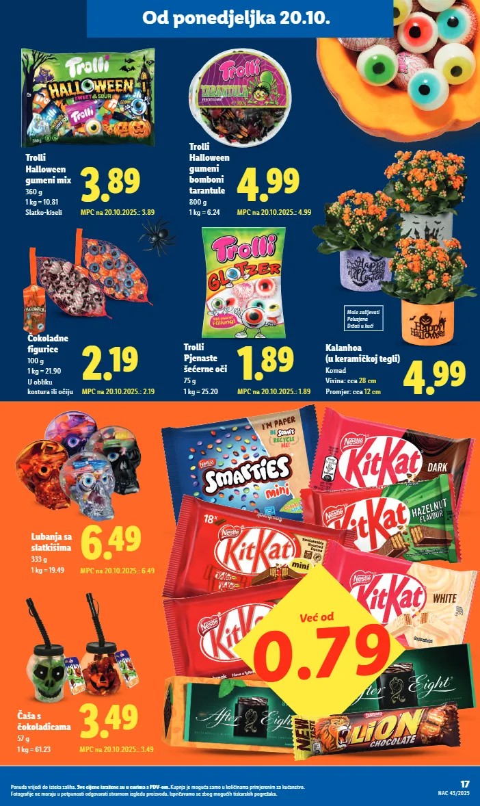 6.49 mpc na 20.10.2025.: 6.49 lubanja sa slatkišima 333 g 1 kg = 19.49 3.49 mpc na 20.10.2025.: 3.49 čaša s čokoladicama 57 g 1 kg = 61.23 2.19 mpc na 20.10.2025.: 2.19 čokoladne figurice 100 g 1 kg = 21.90 u obliku kostura ili očiju 1.89 mpc na 20.10.2025.: 1.89 trolli pjenaste šećerne oči 75 g 1 kg = 25.20 4.99 mpc na 20.10.2025.: 4.99 trolli halloween gumeni bomboni tarantule 800 g 1 kg = 6.24 3.89 mpc na 20.10.2025.: 3.89 trolli halloween gumeni mix 360 g 1 kg = 10.81 slatko-kiseli 0.79 već od malo zalijevati polusjena držati u kući 4.99 kalanhoa (u keramičkoj tegli) komad visina: cca 28 cm promjer: cca 12 cm 17 nac 43/2025 ponuda vrijedi do isteka zaliha. sve cijene izražene su u eurima s pdv-om. kupnja je moguća samo u količinama primjerenim za kućanstvo. fotografije ne moraju u potpunosti odgovarati stvarnom izgledu proizvoda. ispričavamo se zbog mogućih tiskarskih pogrešaka. od ponedjeljka 20.10.