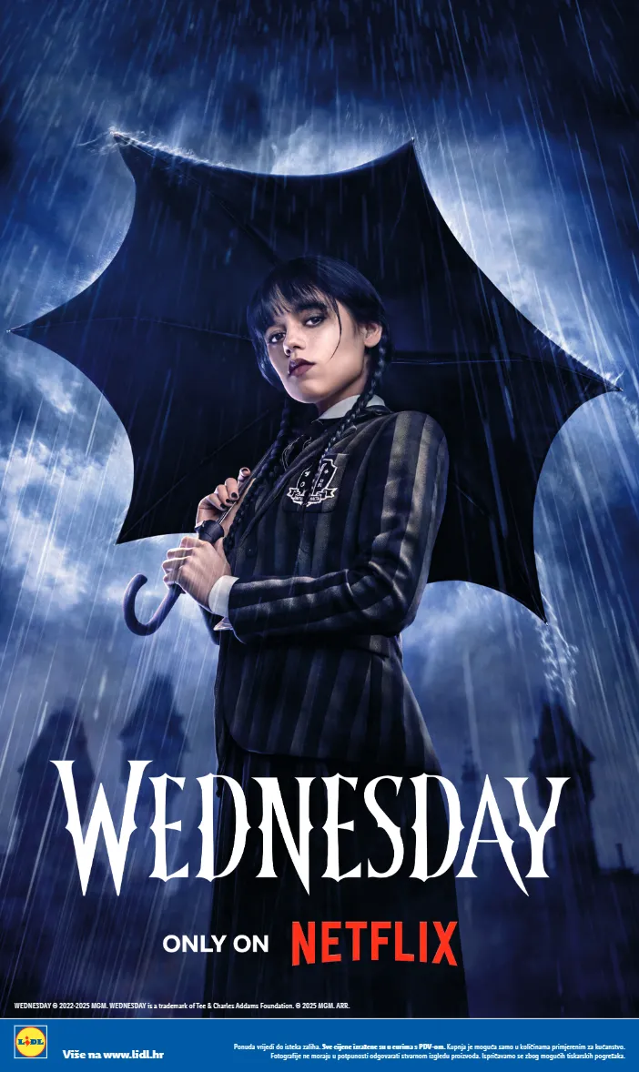 WEDNESDAY © 2022-2025 MGM. WEDNESDAY is a trademark of Tee & Charles Addams Foundation. © 2025 MGM. ARR. Ponuda vrijedi do isteka zaliha. Sve cijene izražene su u eurima s PDV-om. Kupnja je moguća samo u količinama primjerenim za kućanstvo. Fotografije ne moraju u potpunosti odgovarati stvarnom izgledu proizvoda. Ispričavamo se zbog mogućih tiskarskih pogrešaka. Više na www.lidl.hr
