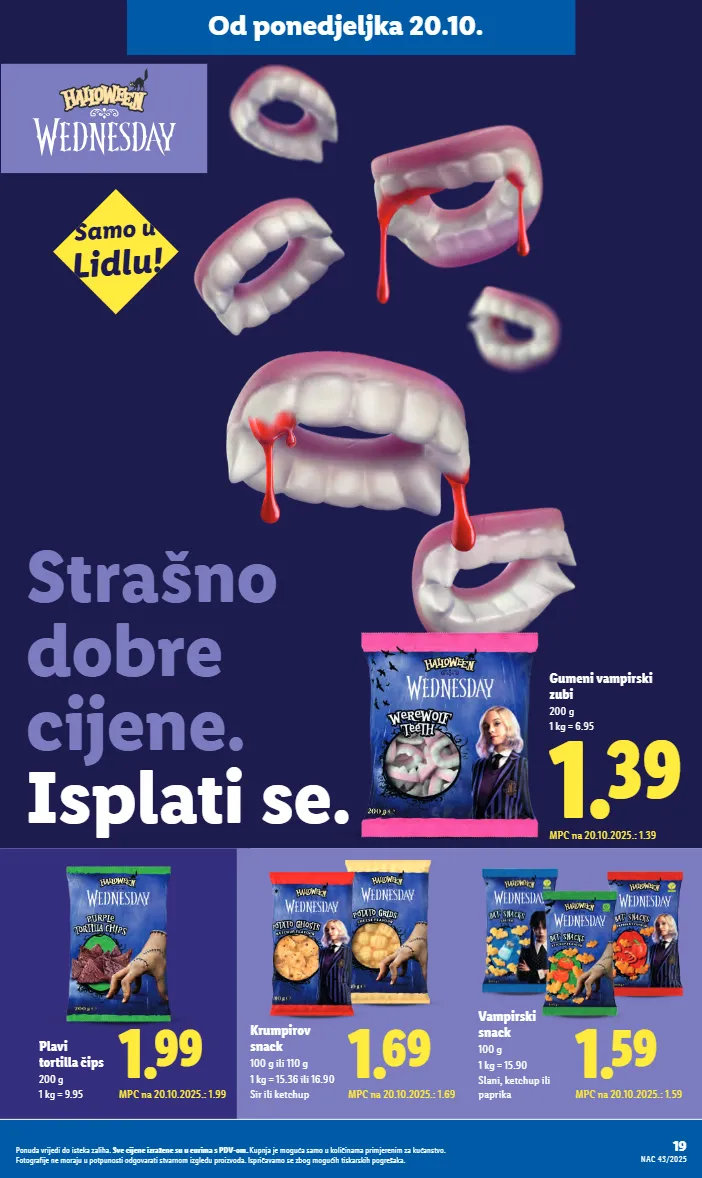 1.59 mpc na 20.10.2025.: 1.59 vampirski snack 100 g 1 kg = 15.90 slani, ketchup ili paprika 1.69 mpc na 20.10.2025.: 1.69 krumpirov snack 100 g ili 110 g 1 kg = 15.36 ili 16.90 sir ili ketchup 1.39 mpc na 20.10.2025.: 1.39 gumeni vampirski zubi 200 g 1 kg = 6.95 1.99 mpc na 20.10.2025.: 1.99 plavi tortilla čips 200 g 1 kg = 9.95 samo u lidlu! strašno dobre cijene. isplati se. 19 nac 43/2025 ponuda vrijedi do isteka zaliha. sve cijene izražene su u eurima s pdv-om. kupnja je moguća samo u količinama primjerenim za kućanstvo. fotografije ne moraju u potpunosti odgovarati stvarnom izgledu proizvoda. ispričavamo se zbog mogućih tiskarskih pogrešaka. od ponedjeljka 20.10.