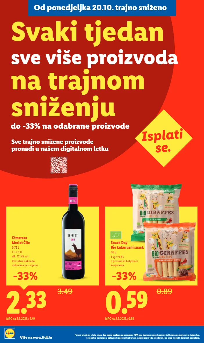 2.33 3.49 Cimarosa Merlot Čile 0.75 L 1 L = 3.11 alk. 12.5% vol Povratna naknada uključena je u cijenu MPC na 2.5.2025.: 3.49 -33% 0.59 0.89 Snack Day Bio kukuruzni snack 60 g 1 kg = 9.83 S prosom ili heljdinim krupicama MPC na 2.5.2025.: 0.89 -33% Isplati se. Svaki tjedan sve više proizvoda na trajnom sniženju do -33% na odabrane proizvode Sve trajno snižene proizvode pronađi u našem digitalnom letku Ponuda vrijedi do isteka zaliha. Sve cijene izražene su u eurima s PDV-om. Kupnja je moguća samo u količinama primjerenim za kućanstvo. Fotografije ne moraju u potpunosti odgovarati stvarnom izgledu proizvoda. Ispričavamo se zbog mogućih tiskarskih pogrešaka. Više na www.lidl.hr Ponuda vrijedi do isteka zaliha. Sve cijene izražene su u eurima s PDV-om. Kupnja je moguća samo u količinama primjerenim za kućanstvo. Fotografije ne moraju u potpunosti odgovarati stvarnom izgledu proizvoda. Ispričavamo se zbog mogućih tiskarskih pogrešaka. Više na www.lidl.hr Od ponedjeljka 20.10. trajno sniženo