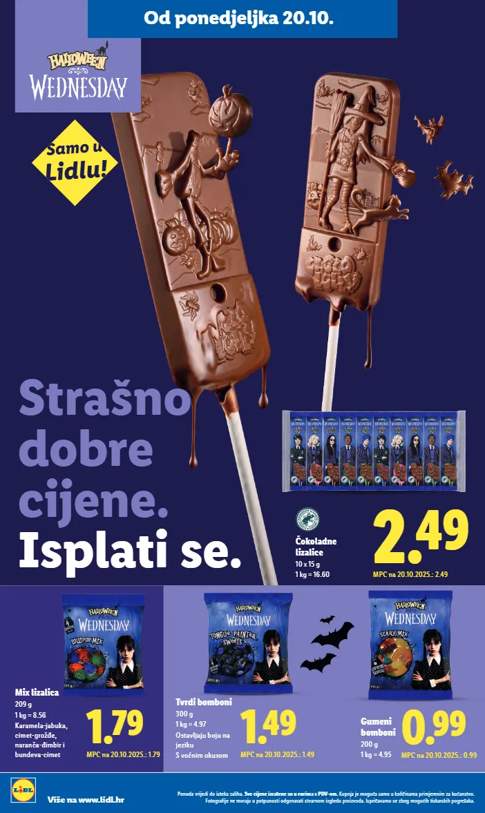 strašno dobre cijene. isplati se. čokoladne lizalice 10 x 15 g 1 kg = 16.60 1.79 mpc na 20.10.2025.: 1.79 mix lizalica 209 g 1 kg = 8.56 karamela-jabuka, cimet-grožđe, naranča-đimbir i bundeva-cimet 1.49 mpc na 20.10.2025.: 1.49 tvrdi bomboni 300 g 1 kg = 4.97 ostavljaju boju na jeziku s voćnim okusom 0.99 mpc na 20.10.2025.: 0.99 gumeni bomboni 200 g 1 kg = 4.95 samo u lidlu! 2.49 mpc na 20.10.2025.: 2.49 ponuda vrijedi do isteka zaliha. sve cijene izražene su u eurima s pdv-om. kupnja je moguća samo u količinama primjerenim za kućanstvo. fotografije ne moraju u potpunosti odgovarati stvarnom izgledu proizvoda. ispričavamo se zbog mogućih tiskarskih pogrešaka. više na www.lidl.hr od ponedjeljka 20.10.