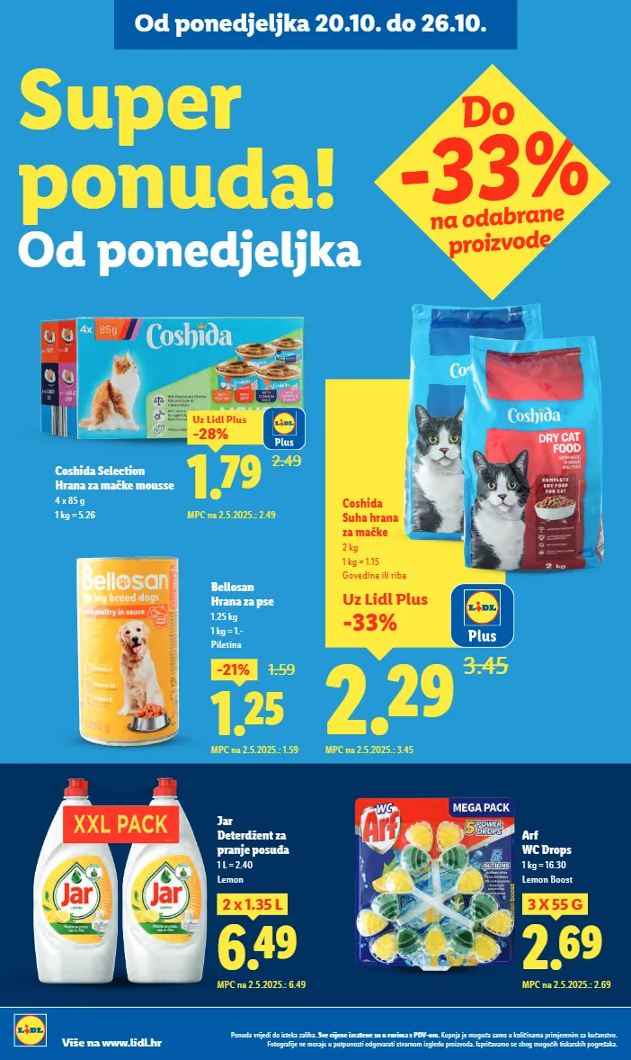 do -33% na odabrane proizvode uz lidl plus -33% 2.29 3.45 coshida suha hrana za mačke 2 kg 1 kg = 1.15 govedina ili riba mpc na 2.5.2025.: 3.45 bellosan hrana za pse 1.25 kg 1 kg = 1.- piletina 2.49 1.79 -28% uz lidl plus mpc na 2.5.2025.: 2.49 coshida selection hrana za mačke mousse 4 x 85 g 1 kg = 5.26 arf wc drops 1 kg = 16.30 lemon boost 1.25 -21% 1.59 mpc na 2.5.2025.: 1.59 jar deterdžent za pranje posuđa 1 l = 2.40 lemon 6.49 2 x 1.35 l mpc na 2.5.2025.: 6.49 2.69 3 x 55 g mpc na 2.5.2025.: 2.69 ponuda vrijedi do isteka zaliha. sve cijene izražene su u eurima s pdv-om. kupnja je moguća samo u količinama primjerenim za kućanstvo. fotografije ne moraju u potpunosti odgovarati stvarnom izgledu proizvoda. ispričavamo se zbog mogućih tiskarskih pogrešaka. više na www.lidl.hr super ponuda! od ponedjeljka od ponedjeljka 20.10. do 26.10.