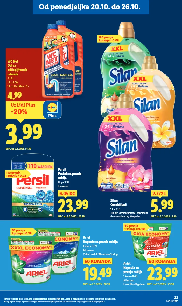 5.99 2.772 l mpc na 2.5.2025.: 5.99 silan omekšivač 1 l = 2.16 jungle, aromatherapy frangipani ili aromatherapy magnolia 126 pranja 1 pranje = 0.05 19.49 50 komada mpc na 2.5.2025.: 20.99 ariel kapsule za pranje rublja 1 kom = 0.39 all in one color fresh ili mountain spring 23.99 6.05 kg mpc na 2.5.2025.: 23.99 persil prašak za pranje rublja 1 kg = 3.97 universal 50 pranja 1 pranje = 0.39 60 pranja 1 pranje = 0.40 110 pranja 1 pranje = 0.22 uz lidl plus -20% 3.99 mpc na 2.5.2025.: 4.99 4.99 wc net gel za odčepljivanje odvoda 2 x 1 l 1 l = 2.50 1 l uz lidl plus = 2.- ariel kapsule za pranje rublja 1 kom = 0.40 all in one extra plus hygiene 23.99 60 komada mpc na 2.5.2025.: 23.99 23 nac 43/2025 ponuda vrijedi do isteka zaliha. sve cijene izražene su u eurima s pdv-om. kupnja je moguća samo u količinama primjerenim za kućanstvo. fotografije ne moraju u potpunosti odgovarati stvarnom izgledu proizvoda. ispričavamo se zbog mogućih tiskarskih pogrešaka. od ponedjeljka 20.10. do 26.10.