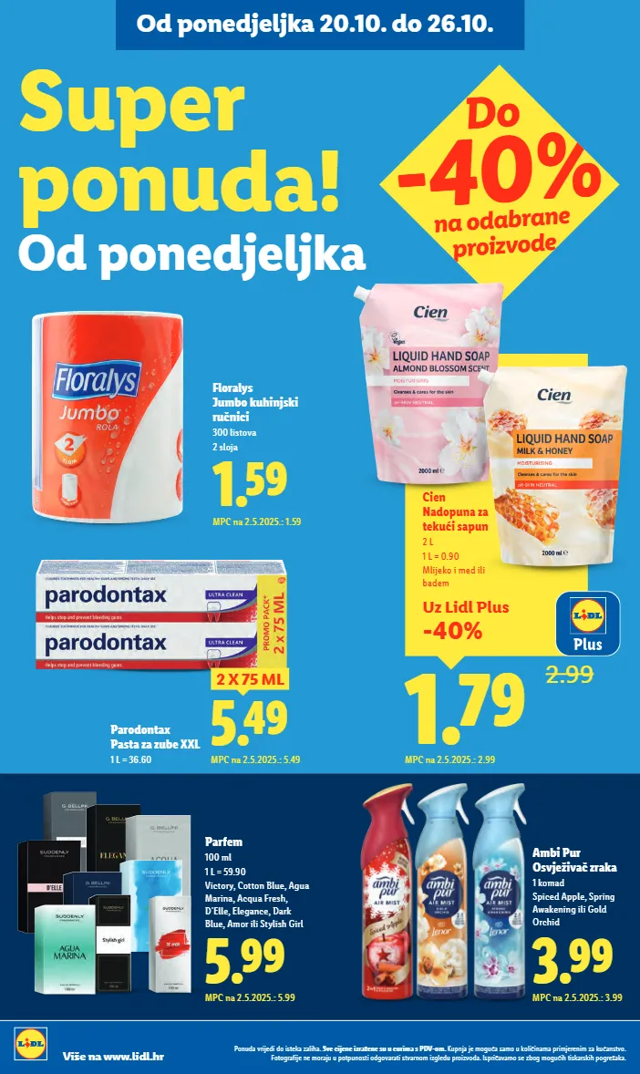 uz lidl plus -40% 1.79 2.99 cien nadopuna za tekući sapun 2 l 1 l = 0.90 mlijeko i med ili badem mpc na 2.5.2025.: 2.99 do -40% na odabrane proizvode parodontax pasta za zube xxl 1 l = 36.60 parfem 100 ml 1 l = 59.90 victory, cotton blue, agua marina, acqua fresh, d'elle, elegance, dark blue, amor ili stylish girl 5.99 mpc na 2.5.2025.: 5.99 1.59 mpc na 2.5.2025.: 1.59 floralys jumbo kuhinjski ručnici 300 listova 2 sloja 3.99 mpc na 2.5.2025.: 3.99 ambi pur osvježivač zraka 1 komad spiced apple, spring awakening ili gold orchid 5.49 2 x 75 ml mpc na 2.5.2025.: 5.49 ponuda vrijedi do isteka zaliha. sve cijene izražene su u eurima s pdv-om. kupnja je moguća samo u količinama primjerenim za kućanstvo. fotografije ne moraju u potpunosti odgovarati stvarnom izgledu proizvoda. ispričavamo se zbog mogućih tiskarskih pogrešaka. više na www.lidl.hr super ponuda! od ponedjeljka od ponedjeljka 20.10. do 26.10.