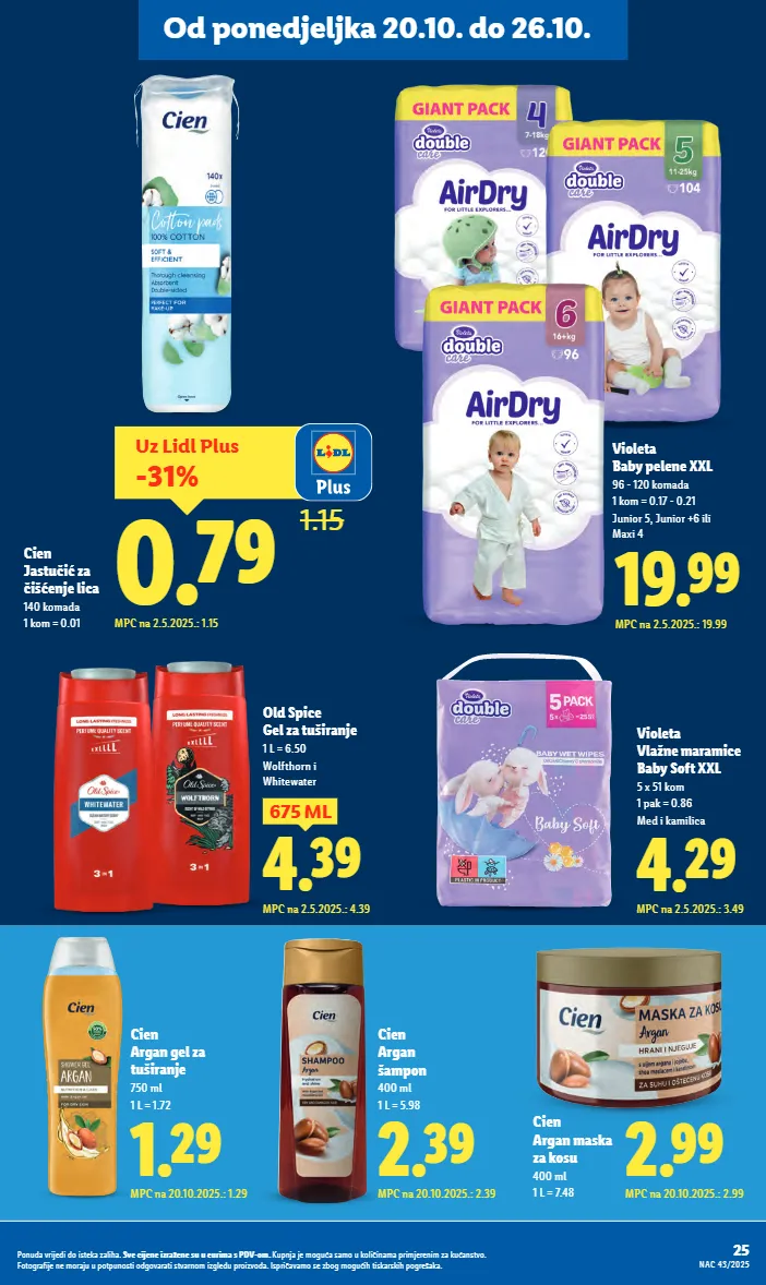 4.39 675 ml mpc na 2.5.2025.: 4.39 old spice gel za tuširanje 1 l = 6.50 wolfthorn i whitewater 4.29 mpc na 2.5.2025.: 3.49 violeta vlažne maramice baby soft xxl 5 x 51 kom 1 pak = 0.86 med i kamilica 19.99 mpc na 2.5.2025.: 19.99 violeta baby pelene xxl 96 - 120 komada 1 kom = 0.17 - 0.21 junior 5, junior +6 ili maxi 4 2.99 mpc na 20.10.2025.: 2.99 cien argan maska za kosu 400 ml 1 l = 7.48 2.39 mpc na 20.10.2025.: 2.39 cien argan šampon 400 ml 1 l = 5.98 uz lidl plus -31% 0.79 1.15 mpc na 2.5.2025.: 1.15 cien jastučić za čišćenje lica 140 komada 1 kom = 0.01 1.29 mpc na 20.10.2025.: 1.29 cien argan gel za tuširanje 750 ml 1 l = 1.72 25 nac 43/2025 ponuda vrijedi do isteka zaliha. sve cijene izražene su u eurima s pdv-om. kupnja je moguća samo u količinama primjerenim za kućanstvo. fotografije ne moraju u potpunosti odgovarati stvarnom izgledu proizvoda. ispričavamo se zbog mogućih tiskarskih pogrešaka. od ponedjeljka 20.10. do 26.10.
