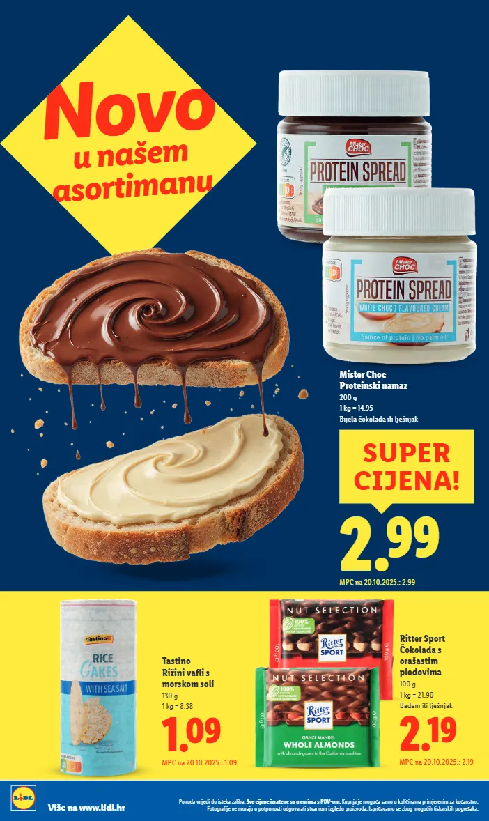 novo u našem asortimanu 1.09 mpc na 20.10.2025.: 1.09 tastino rižini vafli s morskom soli 130 g 1 kg = 8.38 2.19 mpc na 20.10.2025.: 2.19 ritter sport čokolada s orašastim plodovima 100 g 1 kg = 21.90 badem ili lješnjak 2.99 mpc na 20.10.2025.: 2.99 super cijena! mister choc proteinski namaz 200 g 1 kg = 14.95 bijela čokolada ili lješnjak ponuda vrijedi do isteka zaliha. sve cijene izražene su u eurima s pdv-om. kupnja je moguća samo u količinama primjerenim za kućanstvo. fotografije ne moraju u potpunosti odgovarati stvarnom izgledu proizvoda. ispričavamo se zbog mogućih tiskarskih pogrešaka. više na www.lidl.hr