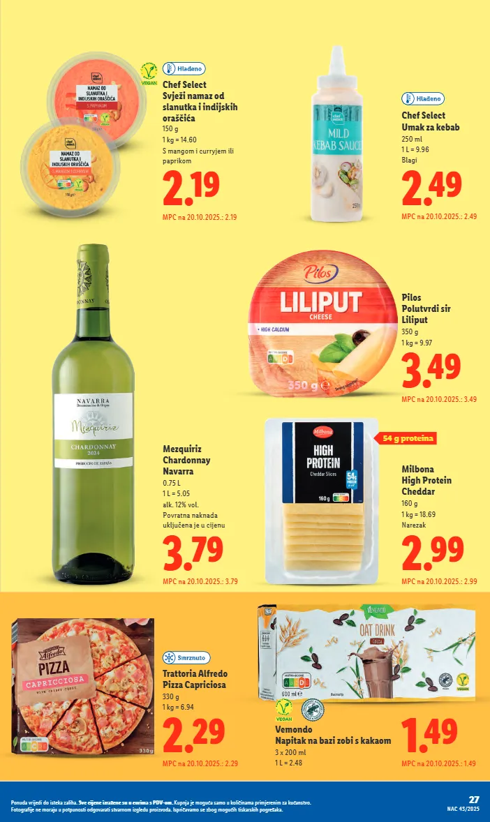 2.49 mpc na 20.10.2025.: 2.49 chef select umak za kebab 250 ml 1 l = 9.96 blagi 1.49 mpc na 20.10.2025.: 1.49 vemondo napitak na bazi zobi s kakaom 3 x 200 ml 1 l = 2.48 3.79 mpc na 20.10.2025.: 3.79 mezquiriz chardonnay navarra 0.75 l 1 l = 5.05 alk. 12% vol. povratna naknada uključena je u cijenu 2.29 mpc na 20.10.2025.: 2.29 trattoria alfredo pizza capriciosa 330 g 1 kg = 6.94 2.19 mpc na 20.10.2025.: 2.19 chef select svježi namaz od slanutka i indijskih oraščića 150 g 1 kg = 14.60 s mangom i curryjem ili paprikom 2.99 mpc na 20.10.2025.: 2.99 milbona high protein cheddar 160 g 1 kg = 18.69 narezak 3.49 mpc na 20.10.2025.: 3.49 pilos polutvrdi sir liliput 350 g 1 kg = 9.97 54 g proteina 27 nac 43/2025 ponuda vrijedi do isteka zaliha. sve cijene izražene su u eurima s pdv-om. kupnja je moguća samo u količinama primjerenim za kućanstvo. fotografije ne moraju u potpunosti odgovarati stvarnom izgledu proizvoda. ispričavamo se zbog mogućih tiskarskih pogrešaka.
