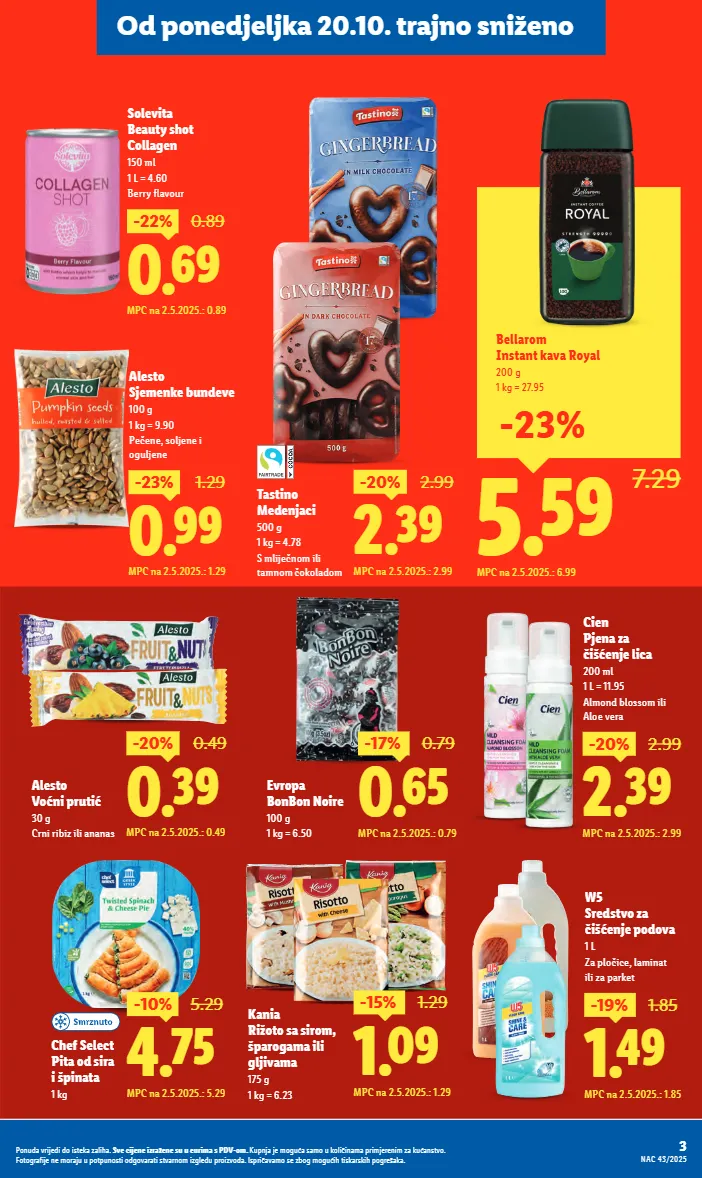 0.39 -20% 0.49 mpc na 2.5.2025.: 0.49 alesto voćni prutić 30 g crni ribiz ili ananas 4.75 -10% 5.29 mpc na 2.5.2025.: 5.29 chef select pita od sira i špinata 1 kg 2.39 -20% 2.99 mpc na 2.5.2025.: 2.99 cien pjena za čišćenje lica 200 ml 1 l = 11.95 almond blossom ili aloe vera 1.09 -15% 1.29 mpc na 2.5.2025.: 1.29 kania rižoto sa sirom, šparogama ili gljivama 175 g 1 kg = 6.23 0.69 -22% 0.89 mpc na 2.5.2025.: 0.89 solevita beauty shot collagen 150 ml 1 l = 4.60 berry flavour 2.39 -20% 2.99 mpc na 2.5.2025.: 2.99 tastino medenjaci 500 g 1 kg = 4.78 s mliječnom ili tamnom čokoladom 1.49 -19% 1.85 mpc na 2.5.2025.: 1.85 w5 sredstvo za čišćenje podova 1 l za pločice, laminat ili za parket 5.59 7.29 bellarom instant kava royal 200 g 1 kg = 27.95 mpc na 2.5.2025.: 6.99 -23% 0.65 -17% 0.79 mpc na 2.5.2025.: 0.79 evropa bonbon noire 100 g 1 kg = 6.50 0.99 -23% 1.29 mpc na 2.5.2025.: 1.29 alesto sjemenke bundeve 100 g 1 kg = 9.90 pečene, soljene i oguljene 3 ponuda vrijedi do isteka zaliha. sve cijene izražene su u eurima s pdv-om. kupnja je moguća samo u količinama primjerenim za kućanstvo. fotografije ne moraju u potpunosti odgovarati stvarnom izgledu proizvoda. ispričavamo se zbog mogućih tiskarskih pogrešaka. 3 nac 43/2025 ponuda vrijedi do isteka zaliha. sve cijene izražene su u eurima s pdv-om. kupnja je moguća samo u količinama primjerenim za kućanstvo. fotografije ne moraju u potpunosti odgovarati stvarnom izgledu proizvoda. ispričavamo se zbog mogućih tiskarskih pogrešaka. od ponedjeljka 20.10. trajno sniženo