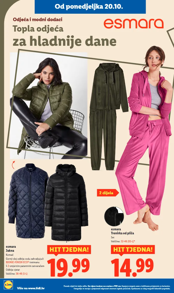 topla odjeća za hladnije dane od ponedjeljka 20.10. esmara jakna komad gornji sloj odbija vodu zahvaljujući bionic-finish eco ® tretmanu s 2 -smjernim patentnim zatvaračem odbija vjetar veličine: 36-46 (s-l) 19.99 hit tjedna! esmara trenirka od pliša set veličine: 32-46 (xs-l)* 14.99 hit tjedna! 2 dijela odjeća i modni dodaci ponuda vrijedi do isteka zaliha. sve cijene izražene su u eurima s pdv-om. kupnja je moguća samo u količinama primjerenim za kućanstvo. fotografije ne moraju u potpunosti odgovarati stvarnom izgledu proizvoda. ispričavamo se zbog mogućih tiskarskih pogrešaka. više na www.lidl.hr