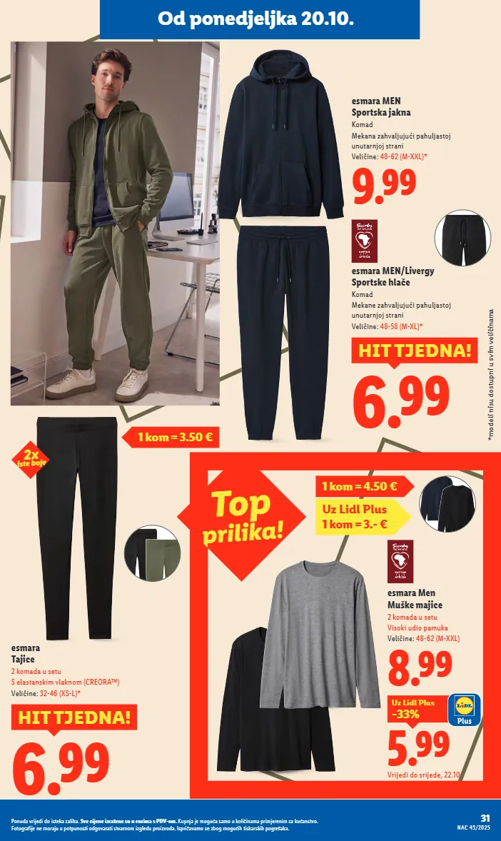 esmara tajice 2 komada u setu s elastanskim vlaknom (creora™) veličine: 32-46 (xs-l)* 6.99 hit tjedna! esmara men/ livergy sportske hlače komad mekane zahvaljujući pahuljastoj unutarnjoj strani veličine: 48-58 (m-xl)* 6.99 hit tjedna! 9.99 esmara men sportska jakna komad mekana zahvaljujući pahuljastoj unutarnjoj strani veličine: 48-62 (m-xxl)* od ponedjeljka 20.10. 1 kom = 3.50 € 2x iste boje *modeli nisu dostupni u svim veličinama 1 kom = 4.50 € uz lidl plus 1 kom = 3.- € top prilika ! esmara men muške majice 2 komada u setu visoki udio pamuka veličine: 48-62 (m-xxl) 8.99 vrijedi do srijede, 22.10. 5.99 -33% uz lidl plus 31 nac 43/2025 ponuda vrijedi do isteka zaliha. sve cijene izražene su u eurima s pdv-om. kupnja je moguća samo u količinama primjerenim za kućanstvo. fotografije ne moraju u potpunosti odgovarati stvarnom izgledu proizvoda. ispričavamo se zbog mogućih tiskarskih pogrešaka.