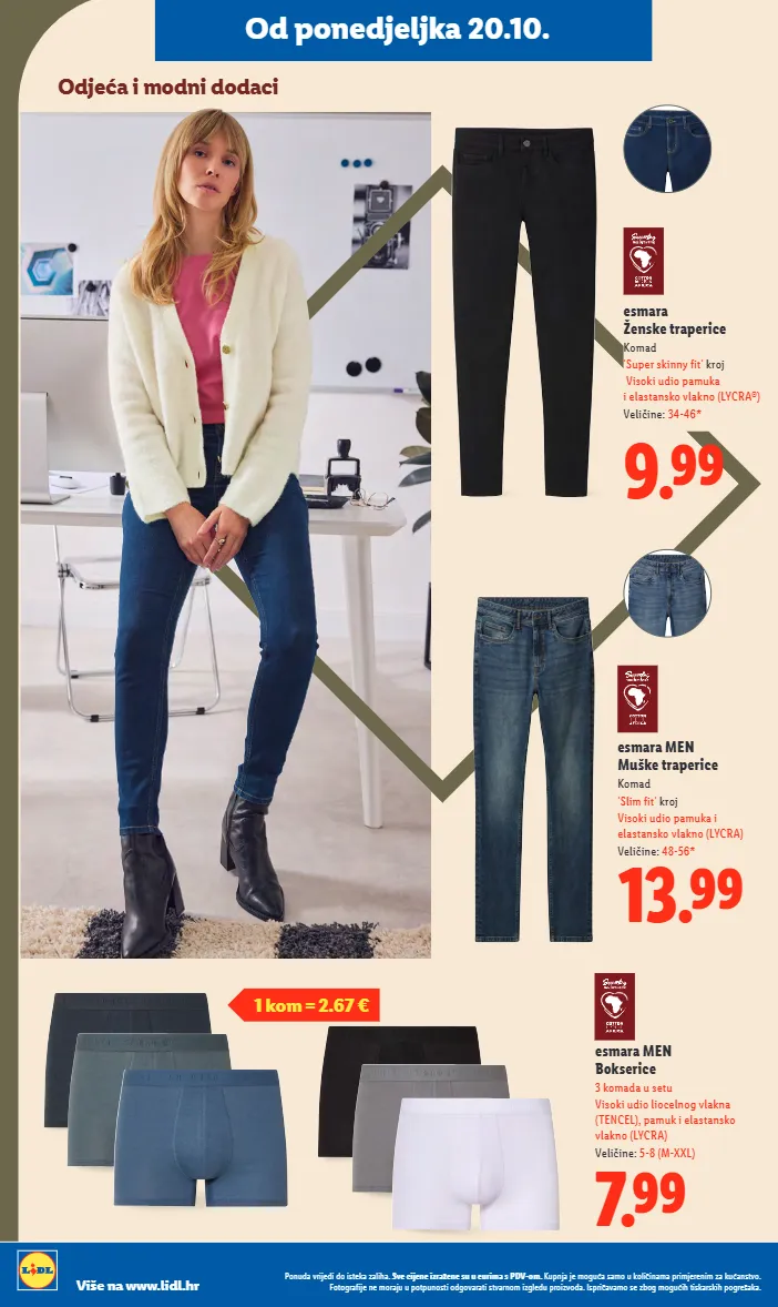 7.99 esmara men bokserice 3 komada u setu visoki udio liocelnog vlakna (tencel), pamuk i elastansko vlakno (lycra) veličine: 5-8 (m-xxl) odjeća i modni dodaci od ponedjeljka 20.10. 1 kom = 2.67 € 9.99 esmara ženske traperice komad 'super skinny fit' kroj visoki udio pamuka i elastansko vlakno (lycra ® ) veličine: 34-46* 13.99 esmara men muške traperice komad 'slim fit' kroj visoki udio pamuka i elastansko vlakno (lycra) veličine: 48-56* ponuda vrijedi do isteka zaliha. sve cijene izražene su u eurima s pdv-om. kupnja je moguća samo u količinama primjerenim za kućanstvo. fotografije ne moraju u potpunosti odgovarati stvarnom izgledu proizvoda. ispričavamo se zbog mogućih tiskarskih pogrešaka. više na www.lidl.hr