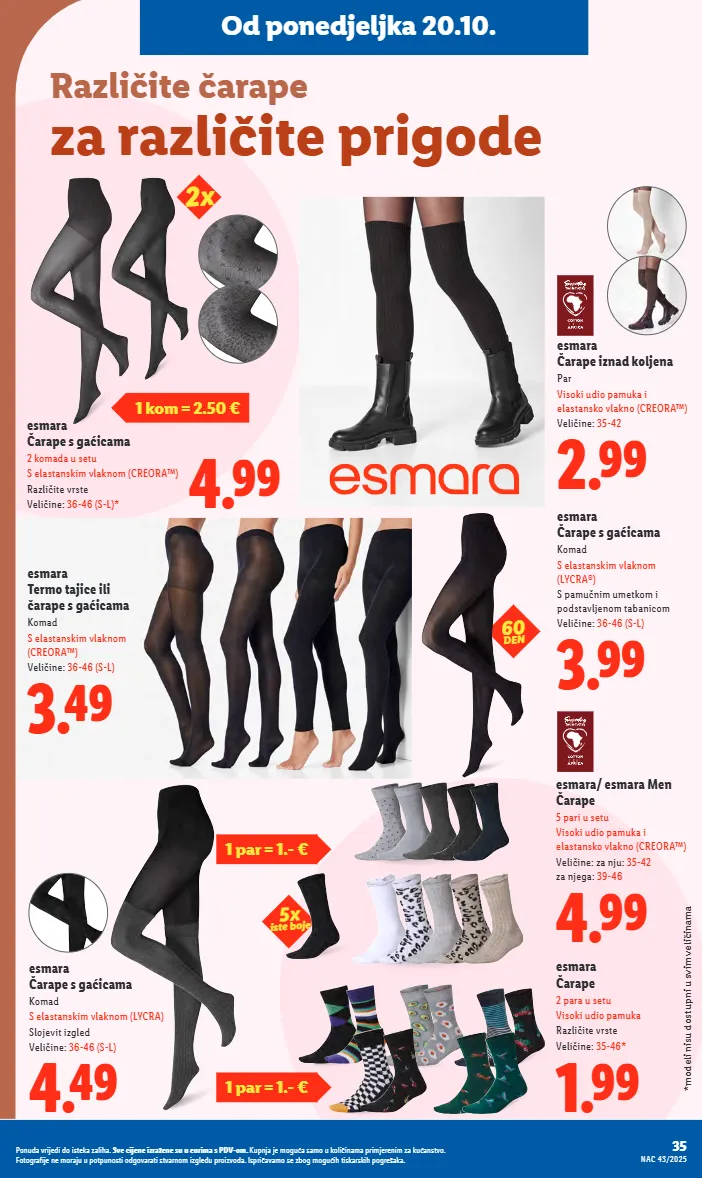 1.99 esmara čarape 2 para u setu visoki udio pamuka različite vrste veličine: 35-46* 2.99 esmara čarape iznad koljena par visoki udio pamuka i elastansko vlakno (creora™) veličine: 35-42 4.99 esmara/ esmara men čarape 5 pari u setu visoki udio pamuka i elastansko vlakno (creora™) veličine: za nju: 35-42 za njega: 39-46 3.99 esmara čarape s gaćicama komad s elastanskim vlaknom (lycra®) s pamučnim umetkom i podstavljenom tabanicom veličine: 36-46 (s-l) 5x iste boje 60 den različite čarape za različite prigode od ponedjeljka 20.10. esmara termo tajice ili čarape s gaćicama komad s elastanskim vlaknom (creora™) veličine: 36-46 (s-l) 3.49 esmara čarape s gaćicama komad s elastanskim vlaknom (lycra) slojevit izgled veličine: 36-46 (s-l) 4.49 1 par = 1.- € 1 par = 1.- € 4.99 esmara čarape s gaćicama 2 komada u setu s elastanskim vlaknom (creora™) različite vrste veličine: 36-46 (s-l)* 1 kom = 2.50 € *modeli nisu dostupni u svim veličinama 2x 35 nac 43/2025 ponuda vrijedi do isteka zaliha. sve cijene izražene su u eurima s pdv-om. kupnja je moguća samo u količinama primjerenim za kućanstvo. fotografije ne moraju u potpunosti odgovarati stvarnom izgledu proizvoda. ispričavamo se zbog mogućih tiskarskih pogrešaka.