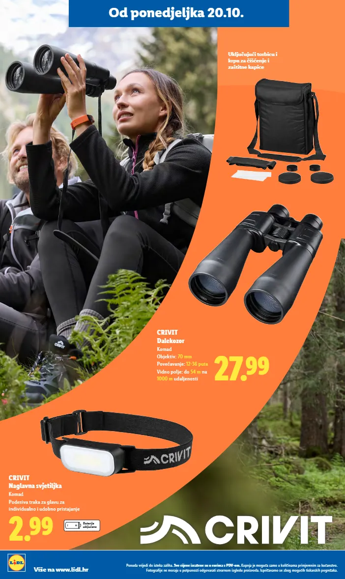 27.99 crivit dalekozor komad objektiv: 70 mm povećavanje: 12-36 puta vidno polje: do 54 m na 1000 m udaljenosti uključujući torbicu i krpu za čišćenje i zaštitne kapice 2.99 crivit naglavna svjetiljka komad podesiva traka za glavu za individualno i udobno pristajanje baterije uključene od ponedjeljka 20.10. ponuda vrijedi do isteka zaliha. sve cijene izražene su u eurima s pdv-om. kupnja je moguća samo u količinama primjerenim za kućanstvo. fotografije ne moraju u potpunosti odgovarati stvarnom izgledu proizvoda. ispričavamo se zbog mogućih tiskarskih pogrešaka. više na www.lidl.hr