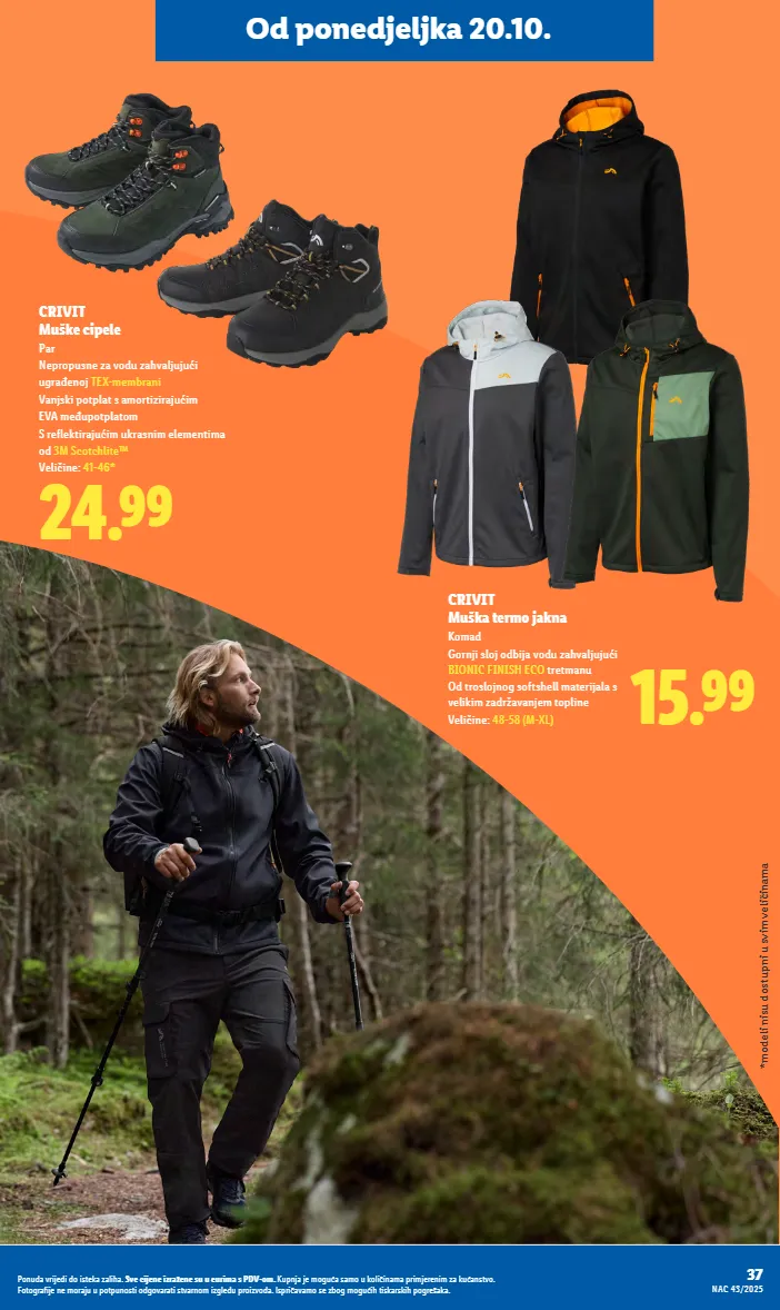 od ponedjeljka 20.10. *modeli nisu dostupni u svim veličinama 24.99 crivit muške cipele par nepropusne za vodu zahvaljujući ugrađenoj tex-membrani vanjski potplat s amortizirajućim eva međupotplatom s reflektirajućim ukrasnim elementima od 3m scotchlite™ veličine: 41-46* 15.99 crivit muška termo jakna komad gornji sloj odbija vodu zahvaljujući bionic finish eco tretmanu od troslojnog softshell materijala s velikim zadržavanjem topline veličine: 48-58 (m-xl) 37 nac 43/2025 ponuda vrijedi do isteka zaliha. sve cijene izražene su u eurima s pdv-om. kupnja je moguća samo u količinama primjerenim za kućanstvo. fotografije ne moraju u potpunosti odgovarati stvarnom izgledu proizvoda. ispričavamo se zbog mogućih tiskarskih pogrešaka.
