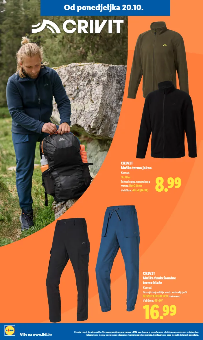 8.99 crivit muška termo jakna komad od flisa tehnologija neutralnog mirisa heiq mint veličine: 48-58 (m-xl) 16.99 crivit muške funkcionalne termo hlače komad gornji sloj odbija vodu zahvaljujući bionic finish eco tretmanu veličine: 48-56* od ponedjeljka 20.10. ponuda vrijedi do isteka zaliha. sve cijene izražene su u eurima s pdv-om. kupnja je moguća samo u količinama primjerenim za kućanstvo. fotografije ne moraju u potpunosti odgovarati stvarnom izgledu proizvoda. ispričavamo se zbog mogućih tiskarskih pogrešaka. više na www.lidl.hr