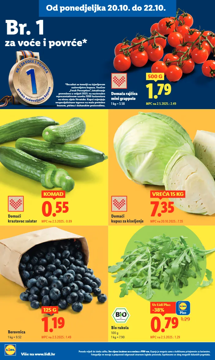 br. 1 za voće i povrće* *rezultat se temelji na izjavljenom zadovoljstvu kupaca. yougov „fresh perception”, istraživanje provedeno u veljači 2025. na nacionalno reprezentativnom uzorku 1200 kućanstava na nivou cijele hrvatske. kupci ocjenjuju nespecijalizirane trgovce na malo pretežno hranom, pićima i duhanskim proizvodima. domaća rajčica mini grappolo 1 kg = 3.58 1.79 500 g mpc na 2.5.2025.: 2.49 od ponedjeljka 20.10. do 22.10. bio rukola 100 g 1 kg = 7.90 domaći krastavac salatar domaći kupus za kiseljenje 0.55 komad mpc na 2.5.2025.: 0.89 7.35 vreća 15 kg mpc na 20.10.2025.: 7.35 ponuda vrijedi do isteka zaliha. sve cijene izražene su u eurima s pdv-om. kupnja je moguća samo u količinama primjerenim za kućanstvo. fotografije ne moraju u potpunosti odgovarati stvarnom izgledu proizvoda. ispričavamo se zbog mogućih tiskarskih pogrešaka. više na www.lidl.hr mpc na 2.5.2025.: 1.29 1.29 0.79 -38% uz lidl plus borovnica 1 kg = 9.52 1.19 125 g mpc na 2.5.2025.: 1.49