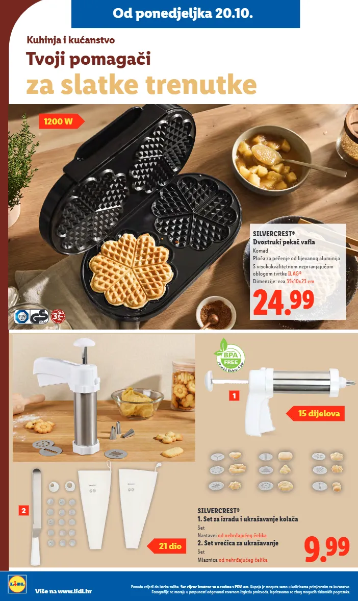 tvoji pomagači za slatke trenutke kuhinja i kućanstvo 24.99 silvercrest® dvostruki pekač vafla komad ploča za pečenje od lijevanog aluminija s visokokvalitetnom neprianjajućom oblogom tvrtke ilag® dimenzije: cca 35x10x23 cm 1200 w 9.99 silvercrest® 1. set za izradu i ukrašavanje kolača set nastavci od nehrđajućeg čelika 2. set vrećica za ukrašavanje set mlaznica od nehrđajućeg čelika od ponedjeljka 20.10. 15 dijelova 21 dio 1 2 ponuda vrijedi do isteka zaliha. sve cijene izražene su u eurima s pdv-om. kupnja je moguća samo u količinama primjerenim za kućanstvo. fotografije ne moraju u potpunosti odgovarati stvarnom izgledu proizvoda. ispričavamo se zbog mogućih tiskarskih pogrešaka. više na www.lidl.hr