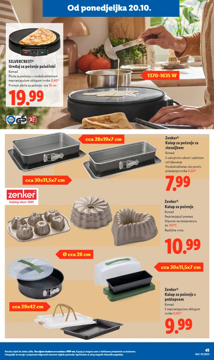 1370-1635 W 19.99 SILVERCREST® Uređaj za pečenje palačinki Komad Ploča za pečenje s visokokvalitetnom neprianjajućom oblogom tvrtke ILAG® Promjer ploče za pečenje: cca 30 cm 7.99 Zenker® Kalup za pečenje sa stezaljkom Komad S odvojivim rubom i zaštitom od izljevanja Visokokvalitetan sloj protiv prianjanja tvrtke ILAG® 10.99 Zenker® Kalup za pečenje Komad Neprianjajući premaz Otporan na temperaturu do 205°C Različite vrste 9.99 Zenker® Kalup za pečenje s poklopcem Komad S neprianjajućom oblogom tvrtke ILAG® cca 30x11,5x7 cm Od ponedjeljka 20.10. cca 28x19x7 cm cca 30x11,5x7 cm Ø cca 26 cm cca 29x42 cm 41 NAC 43/2025 Ponuda vrijedi do isteka zaliha. Sve cijene izražene su u eurima s PDV-om. Kupnja je moguća samo u količinama primjerenim za kućanstvo. Fotografije ne moraju u potpunosti odgovarati stvarnom izgledu proizvoda. Ispričavamo se zbog mogućih tiskarskih pogrešaka.
