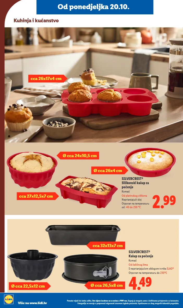 2.99 silvercrest® silikonski kalup za pečenje komad od platinskog silikona neprianjajući sloj otporan na temperaturu od -40 do 250 °c ø cca 24x10,5 cm ø cca 26x4 cm kuhinja i kućanstvo cca 26x17x4 cm cca 27x12,5x7 cm od ponedjeljka 20.10. cca 32x13x7 cm ø cca 26,5x8 cm ø cca 22,5x12 cm 4.49 silvercrest® kalup za pečenje komad od čeličnog lima s neprianjajućom oblogom tvrtke ilag® otporan na temperaturu do 230°c ponuda vrijedi do isteka zaliha. sve cijene izražene su u eurima s pdv-om. kupnja je moguća samo u količinama primjerenim za kućanstvo. fotografije ne moraju u potpunosti odgovarati stvarnom izgledu proizvoda. ispričavamo se zbog mogućih tiskarskih pogrešaka. više na www.lidl.hr