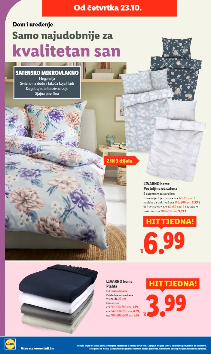 samo najudobnije za kvalitetan san dom i uređenje od četvrtka 23.10. 2 ili 3 dijela livarno home plahta od mikrovlakana prikladna za madrace visine do 20 cm dimenzije: cca 90-100x200 cm, 3.99, cca 140-160x200 cm, 4.99, cca 180-200x200 cm, 5.99 3.99 hit tjedna! od od livarno home posteljina od satena s patentnim zatvaračem dimenzije: 1 jastučnica cca 60x80 cm i 1 navlaka za pokrivač cca 140x200 cm, 6,99 € ili 2 jastučnice cca 60x80 cm i 1 navlaka za pokrivač cca 200x200 cm, 9,99 € 6.99 hit tjedna! satensko mikrovlakno elegancija svileno na dodir i lakoća koja hladi dugotrajne intenzivne boje sjajna površina ponuda vrijedi do isteka zaliha. sve cijene izražene su u eurima s pdv-om. kupnja je moguća samo u količinama primjerenim za kućanstvo. fotografije ne moraju u potpunosti odgovarati stvarnom izgledu proizvoda. ispričavamo se zbog mogućih tiskarskih pogrešaka. više na www.lidl.hr